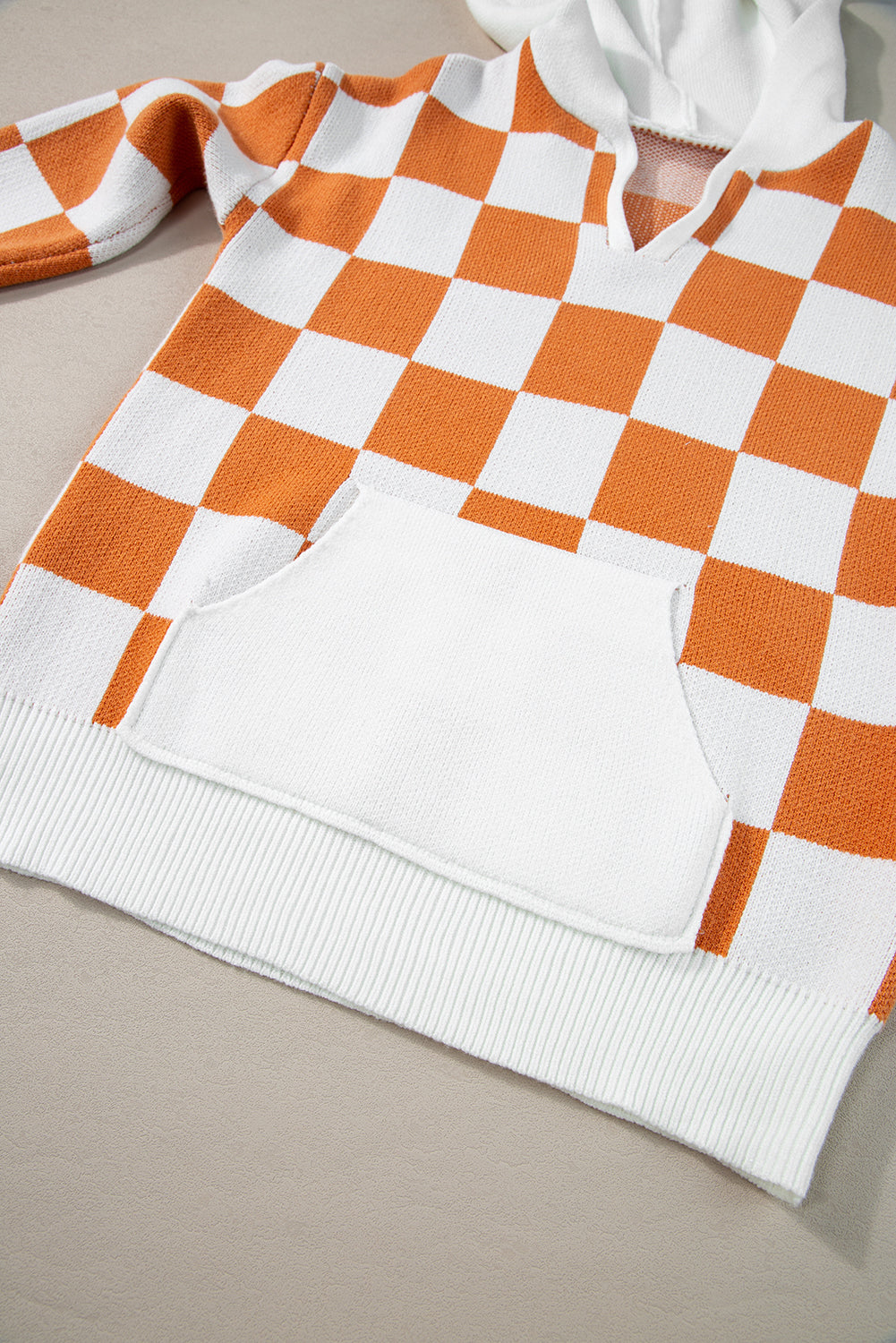 Pull à capuche à carreaux dorés, col fendu, poche kangourou contrastée