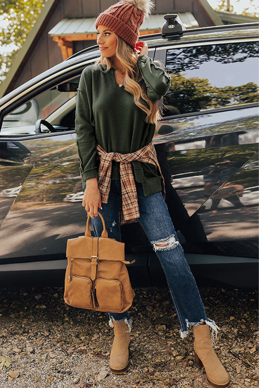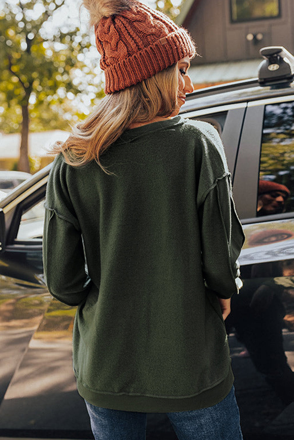 Haut vert à manches longues et col fendu avec coutures apparentes