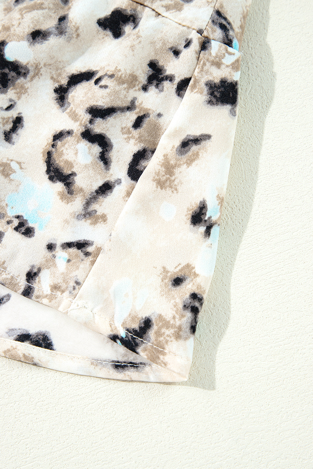 Robe kaki à imprimé léopard, boutonnée sur le devant, manches 3/4, ourlet à volants superposés