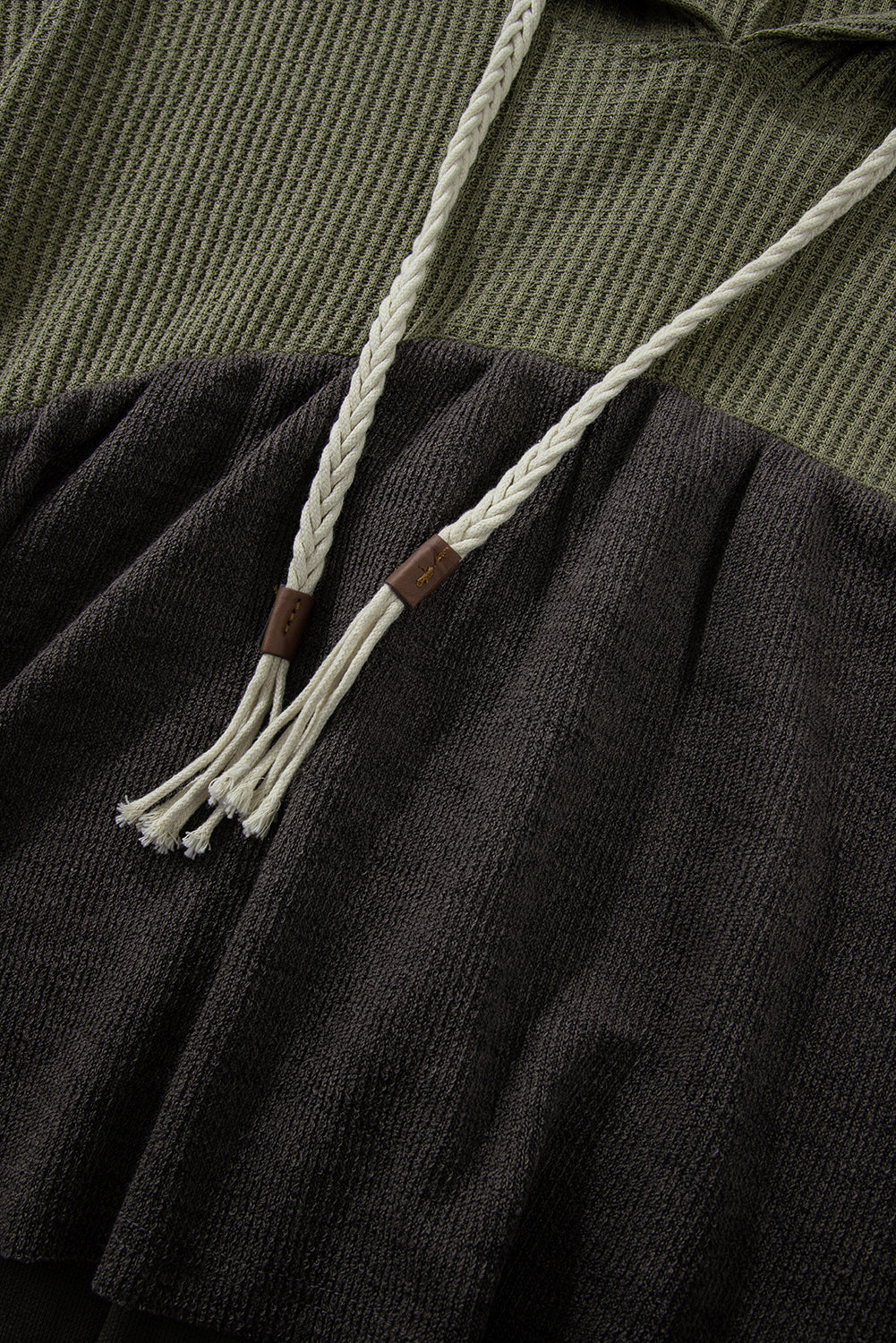 Découvrez un style sans effort avec notre haut à capuche asymétrique vert laurier, à manches larges et patchwork de couleurs contrastées. Conçu avec un mélange unique de textures et un motif patchwork de couleurs contrastées, ce haut est à la fois tendance et fonctionnel. Ses manches larges et son ourlet asymétrique effiloché ajoutent une touche d'originalité, tandis que la capuche offre chaleur et confort. Rehaussez votre garde-robe avec cet incontournable.