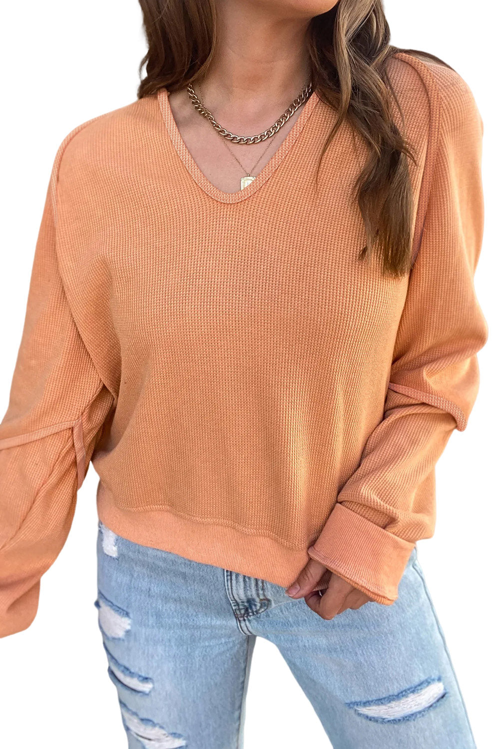 Haut orange uni à manches longues et col en V avec cordon de serrage
