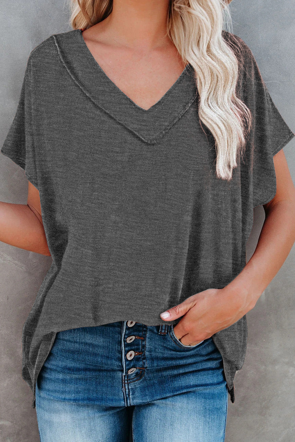 Haut oversize à manches courtes et col en V en mélange de coton délavé minéral