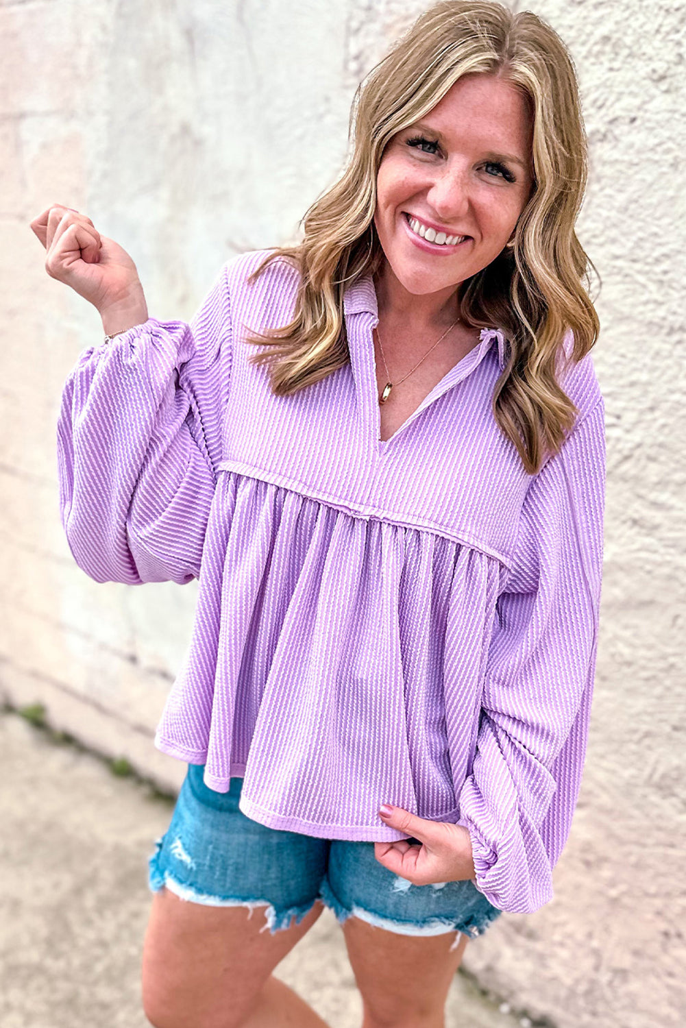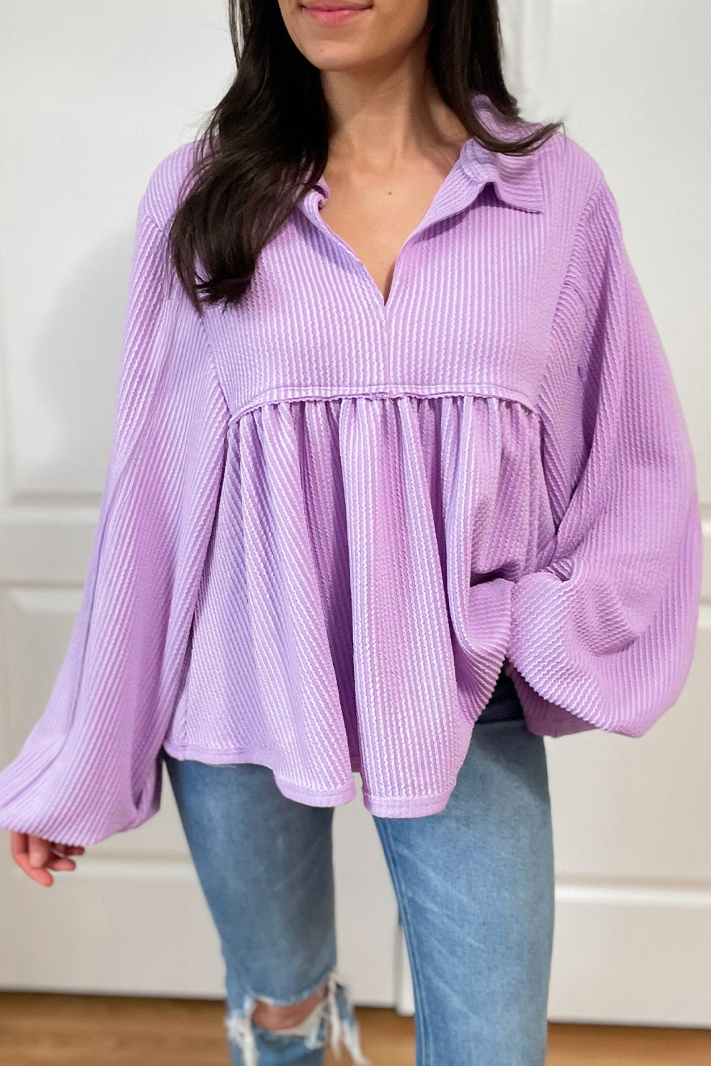 Cette blouse babydoll Phalaenopsis à col V et manches bouffantes en velours côtelé est à la fois élégante et confortable. Son design en velours côtelé ajoute une touche de texture, tandis que son col V et ses manches bouffantes offrent une coupe flatteuse et féminine. Parfaite en toute occasion, elle vous mettra en valeur.