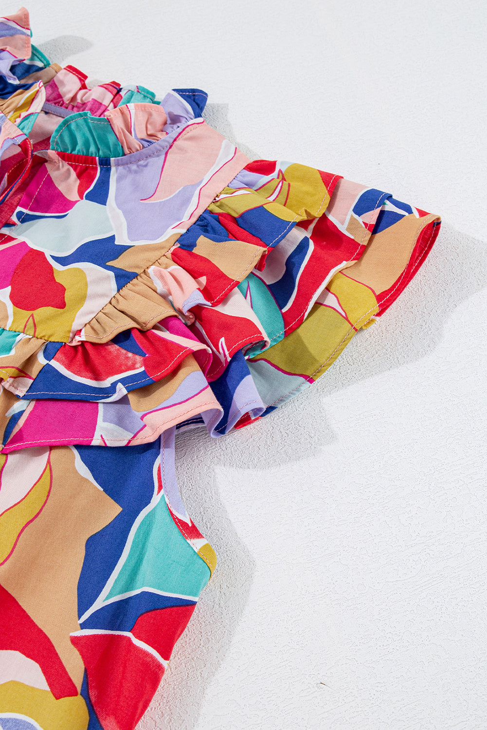 Chemisier rose à imprimé abstrait, manches volantées, col en V fendu et noué