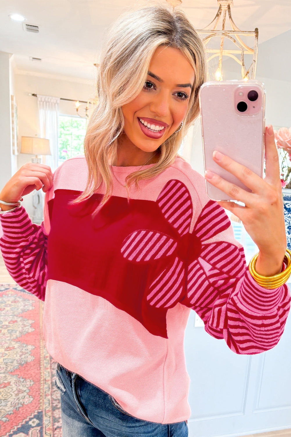 Haut texturé à manches rayées et blocs de couleurs à motif floral rose