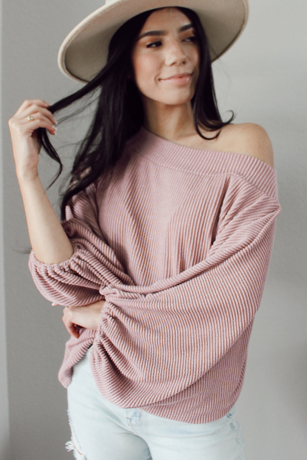 Chemisier côtelé rose à une épaule et manches ballon