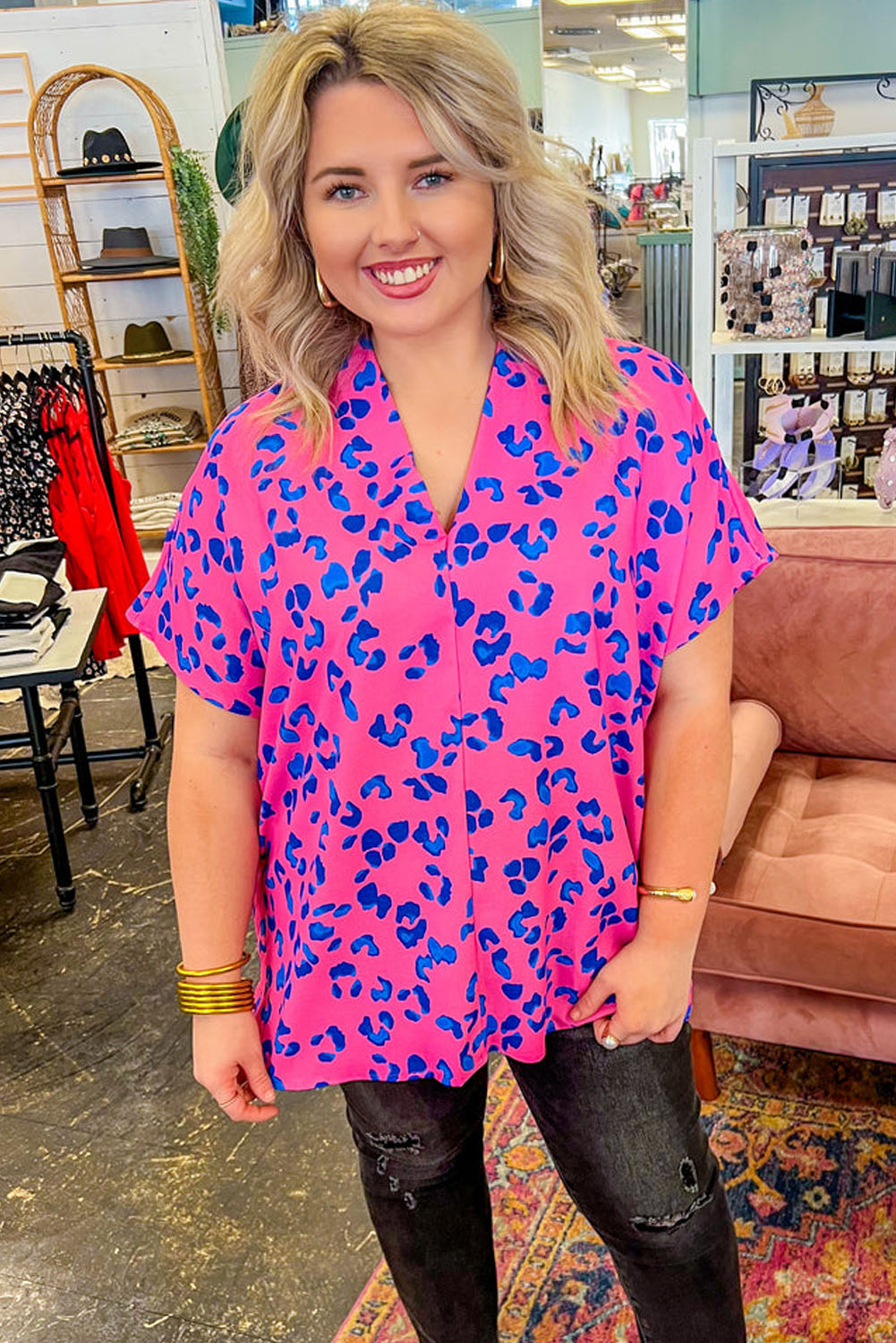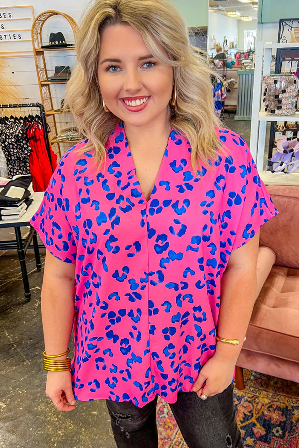 Chemisier col V grande taille à imprimé léopard contrasté rose