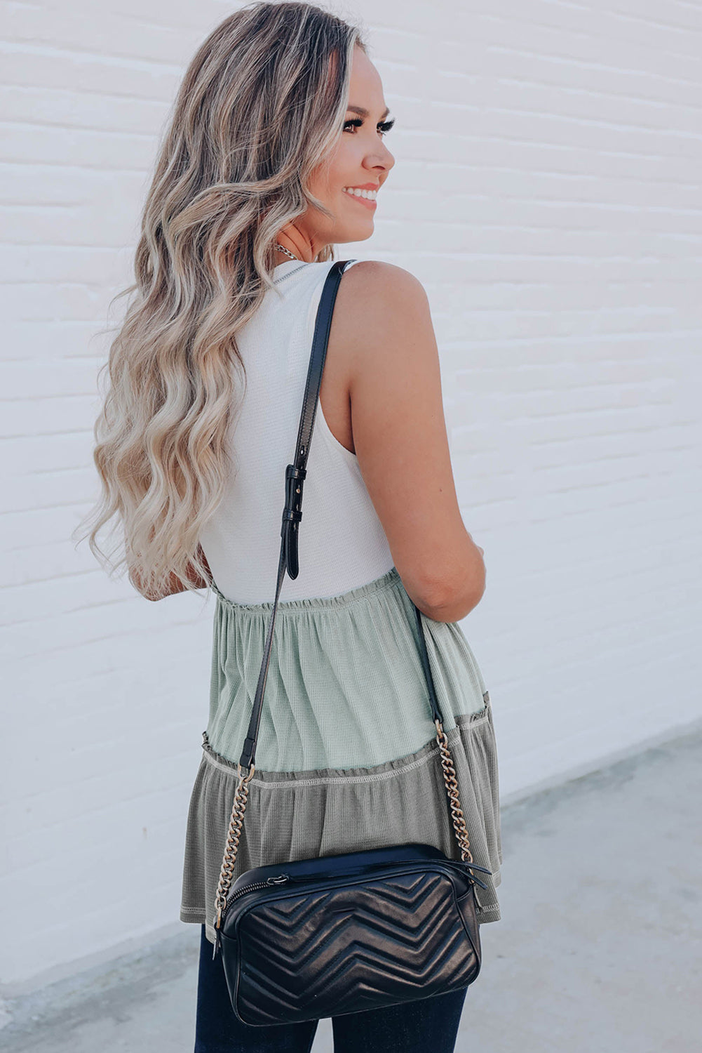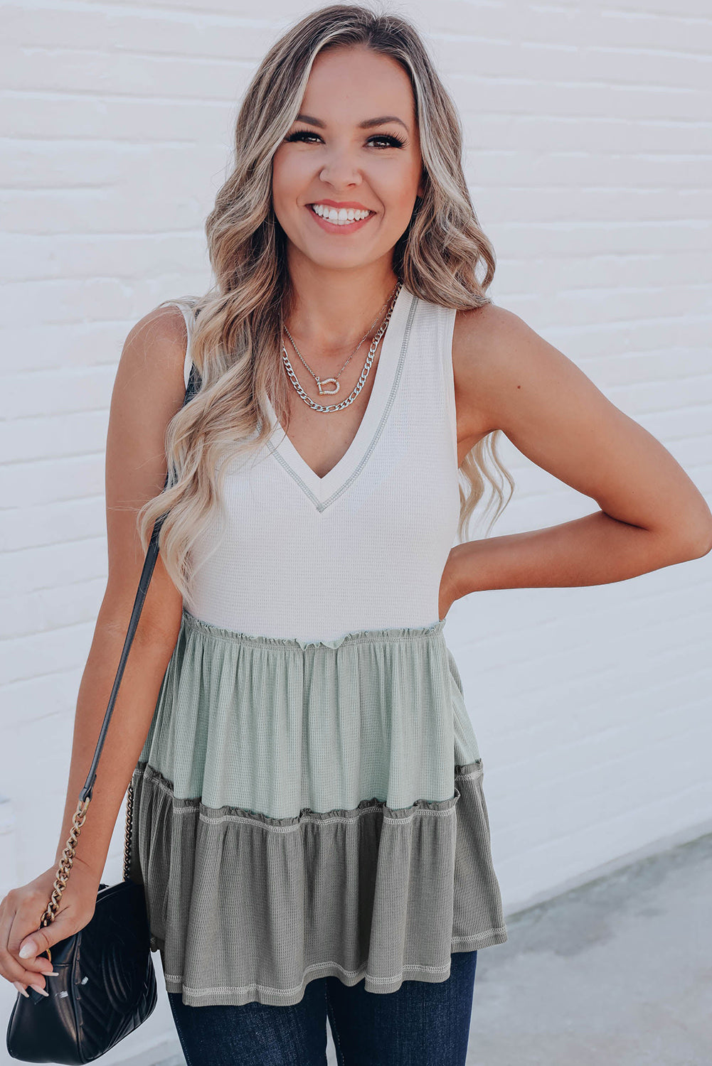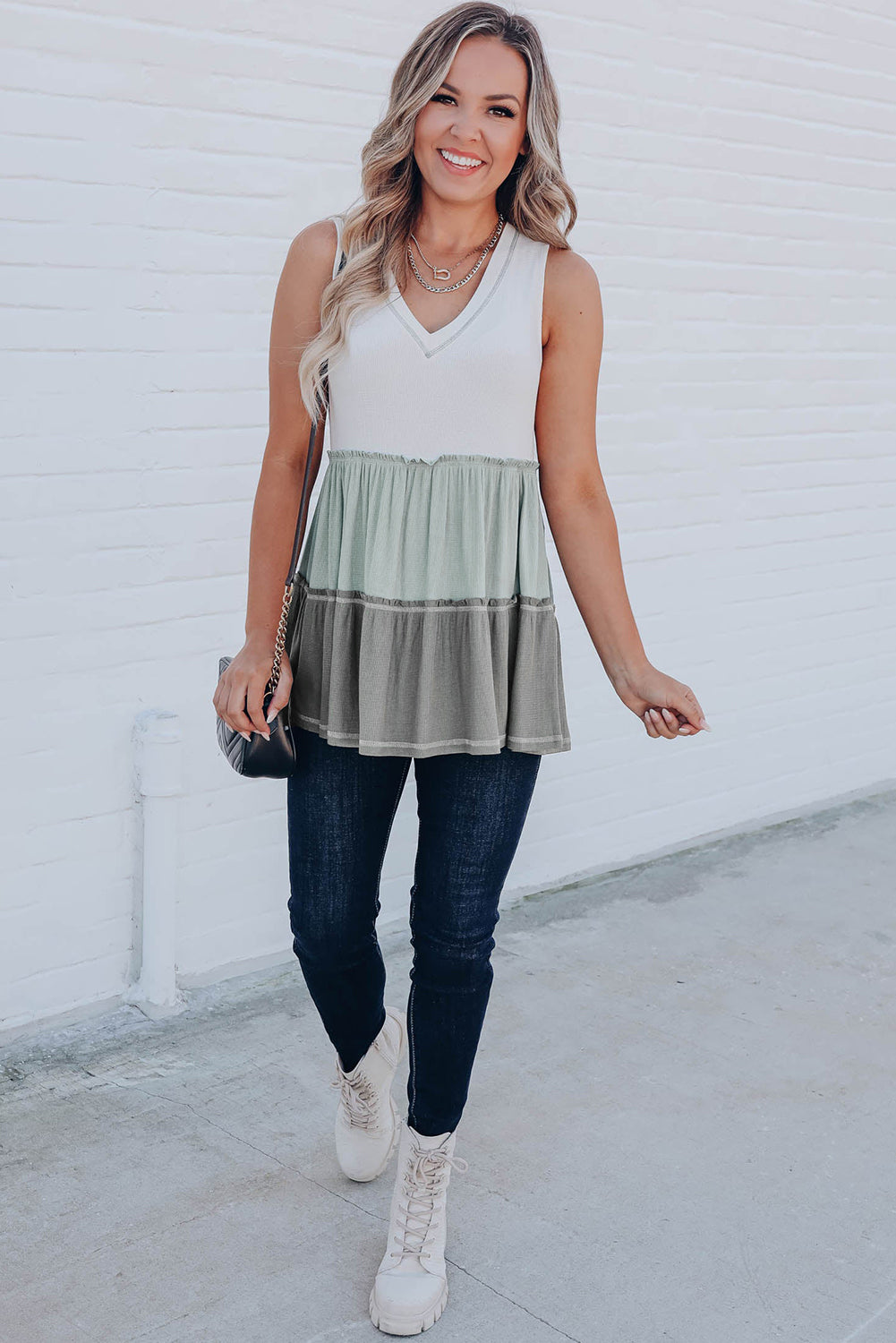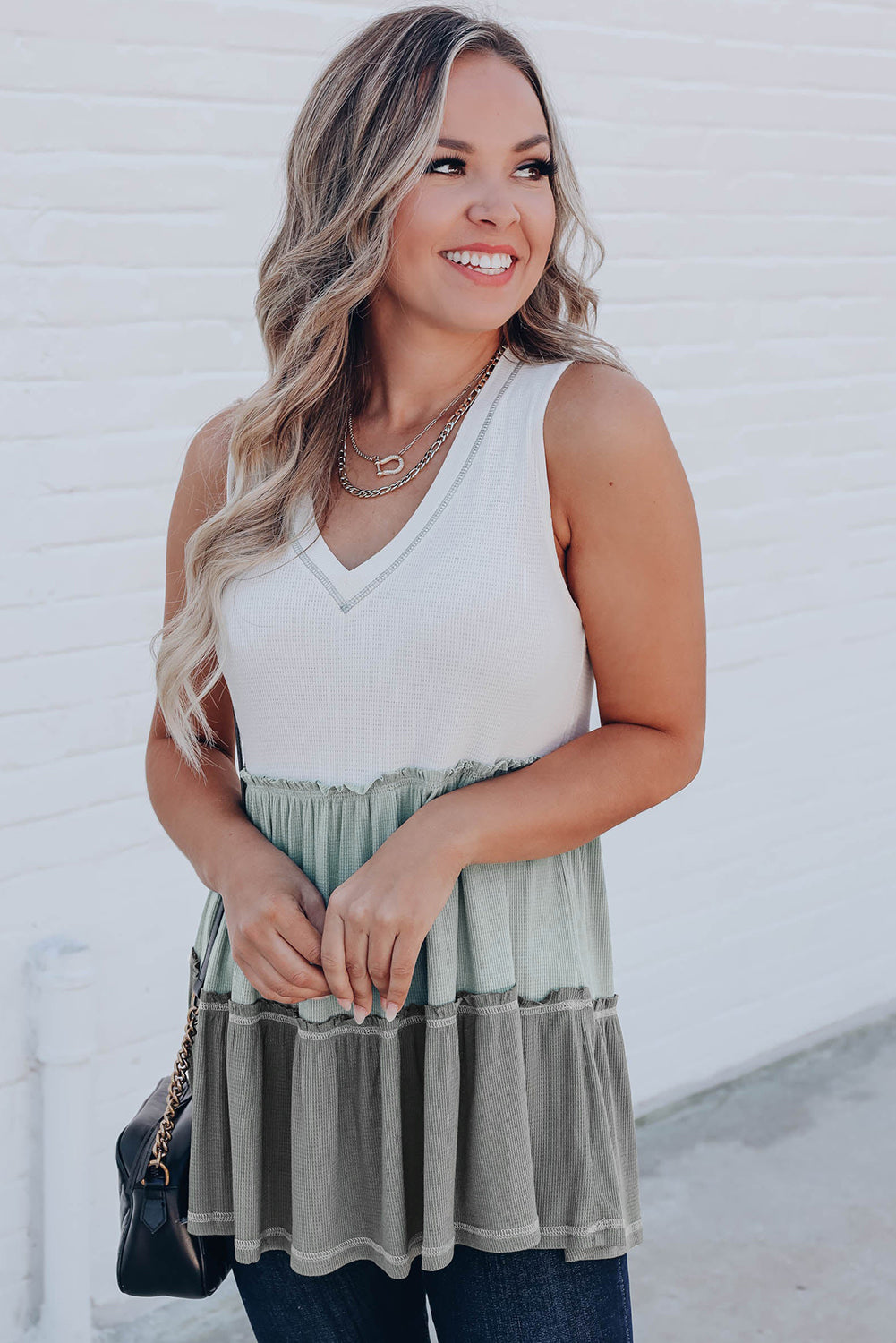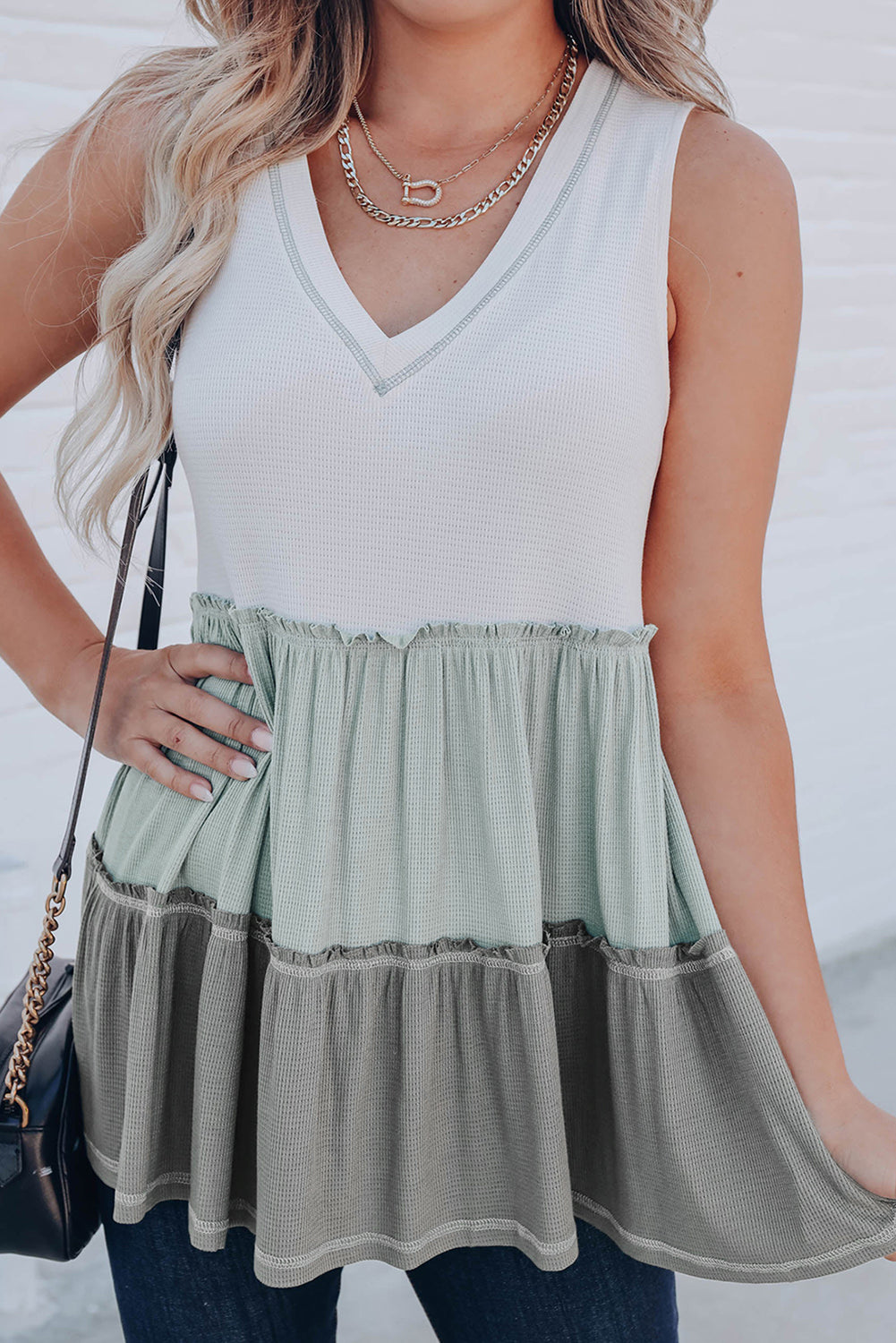 Débardeur à volants et col en V à blocs de couleurs