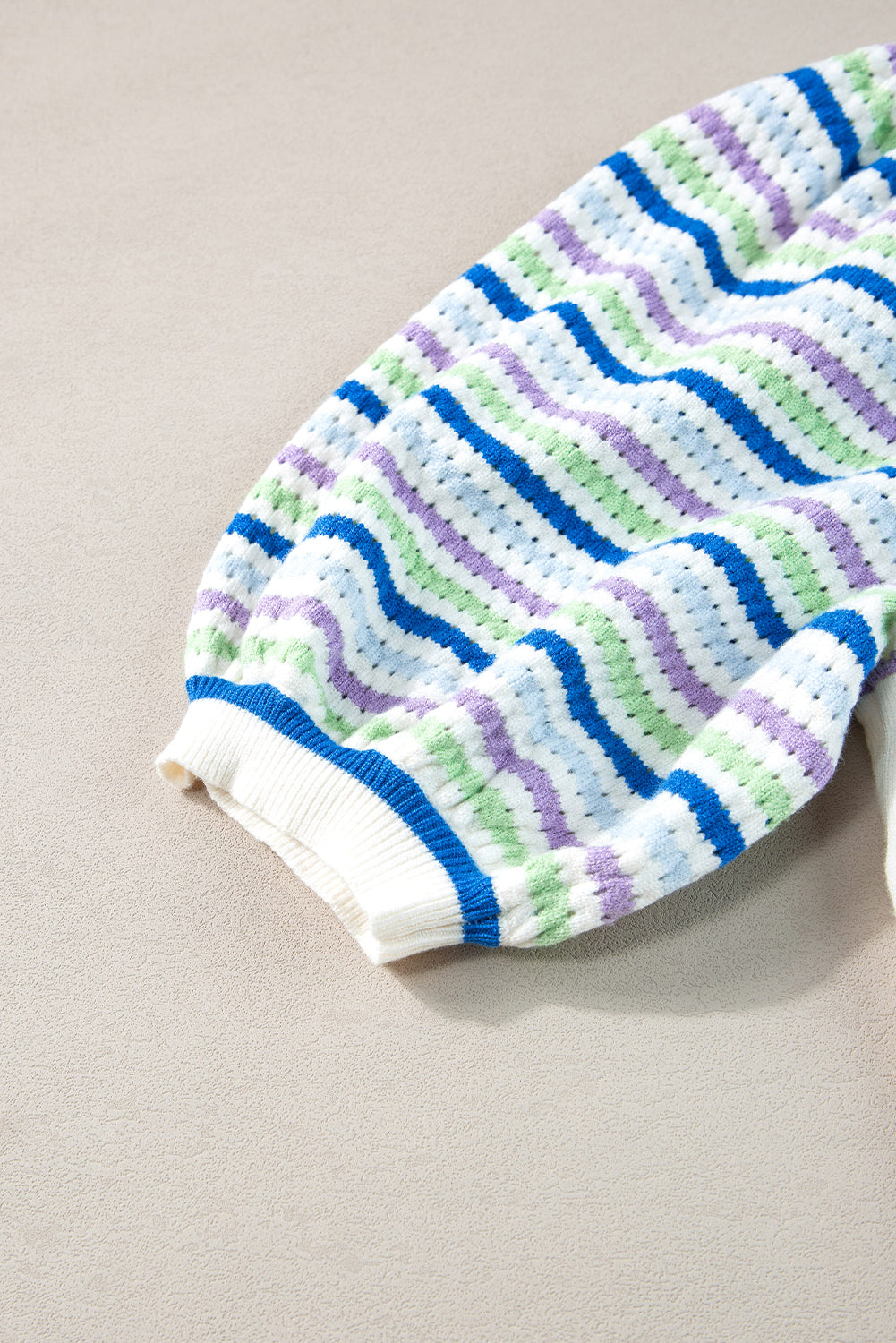Pull en tricot blanc à rayures et manches bouffantes au crochet