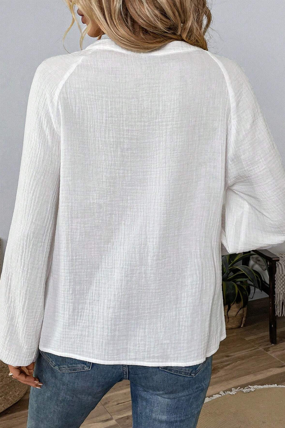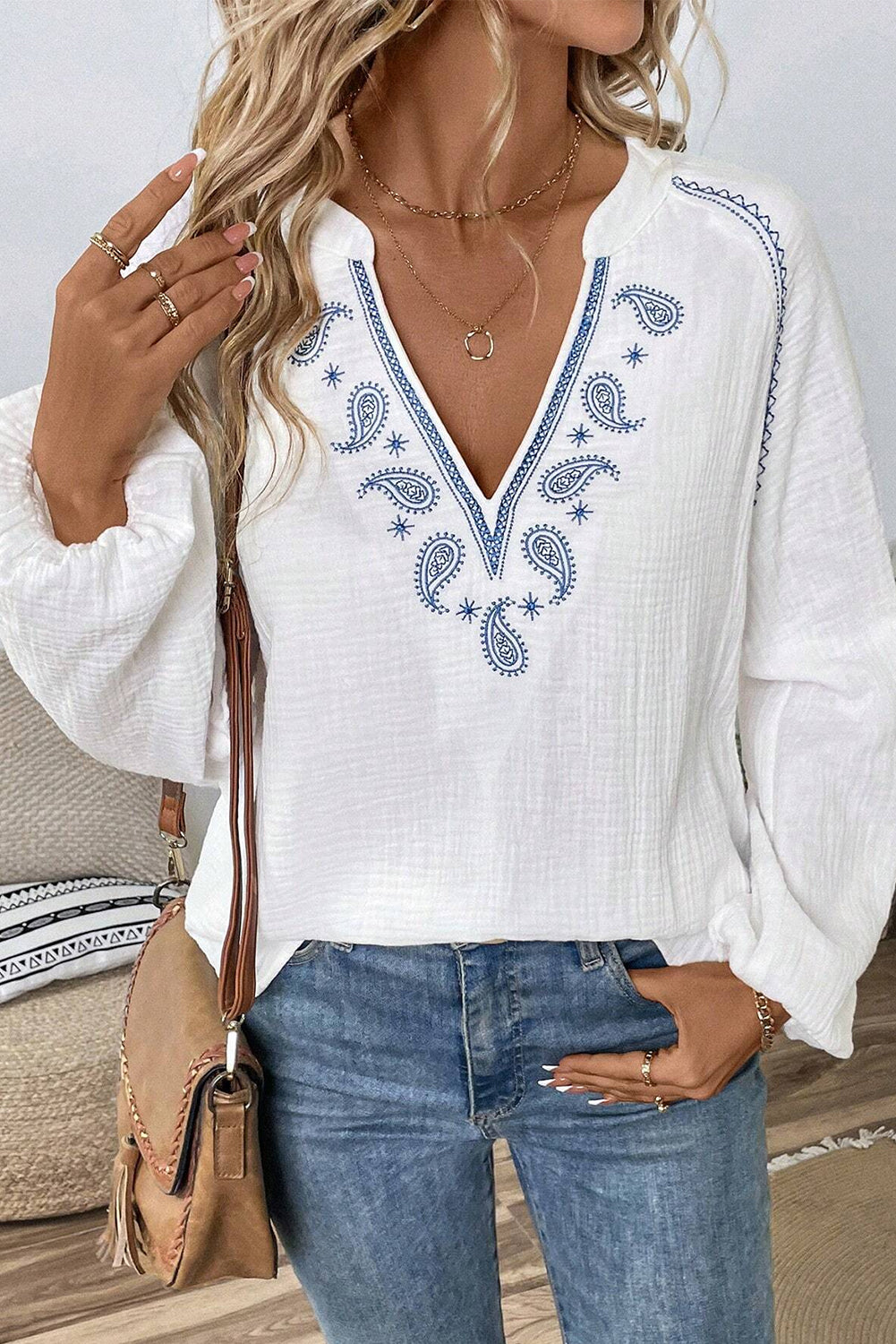 Chemisier blanc à manches longues bouffantes et col fendu texturé brodé cachemire