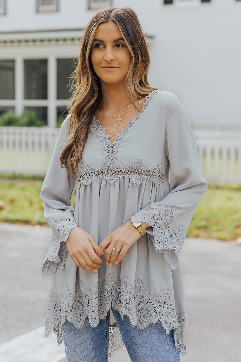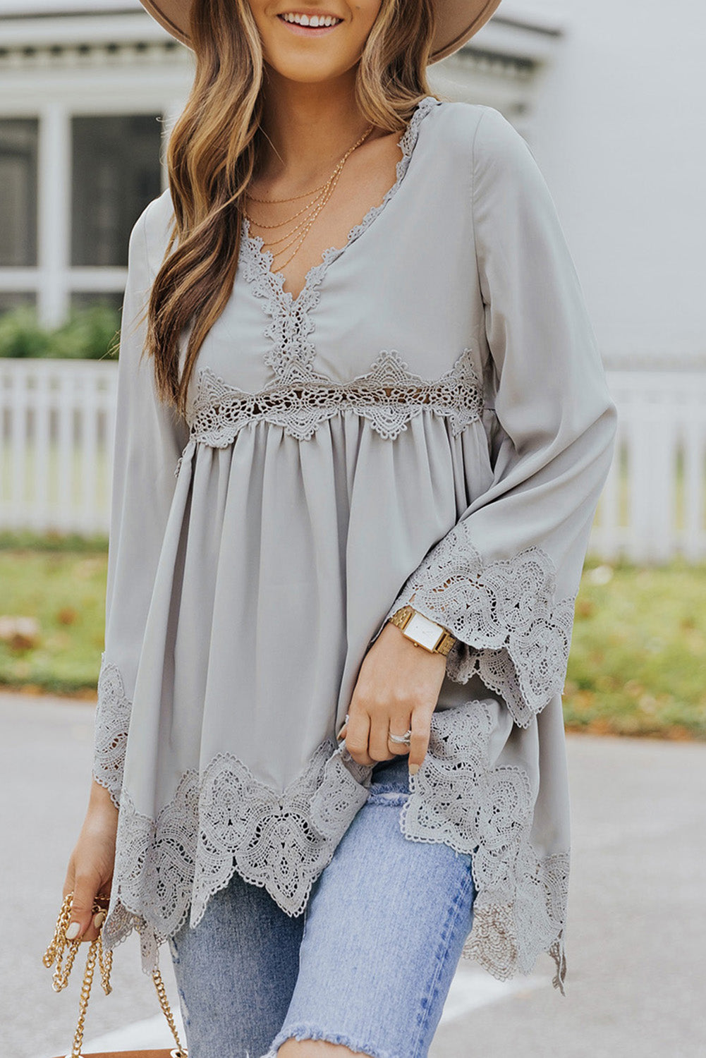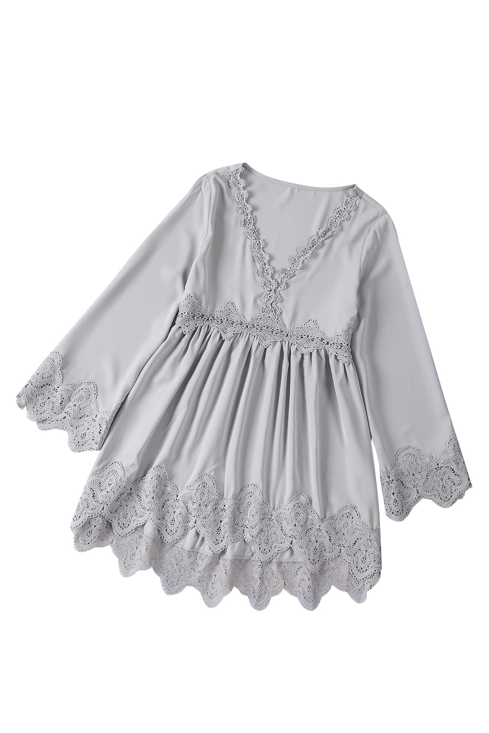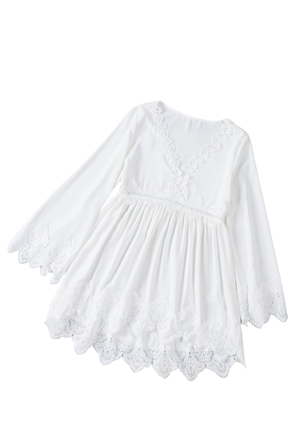 - It features crochet detailing, scalloped edges, beautiful pleats, bell sleeves, and a free spirit flowy fit
