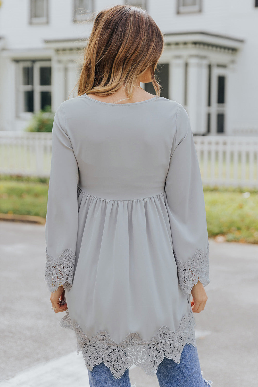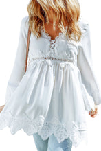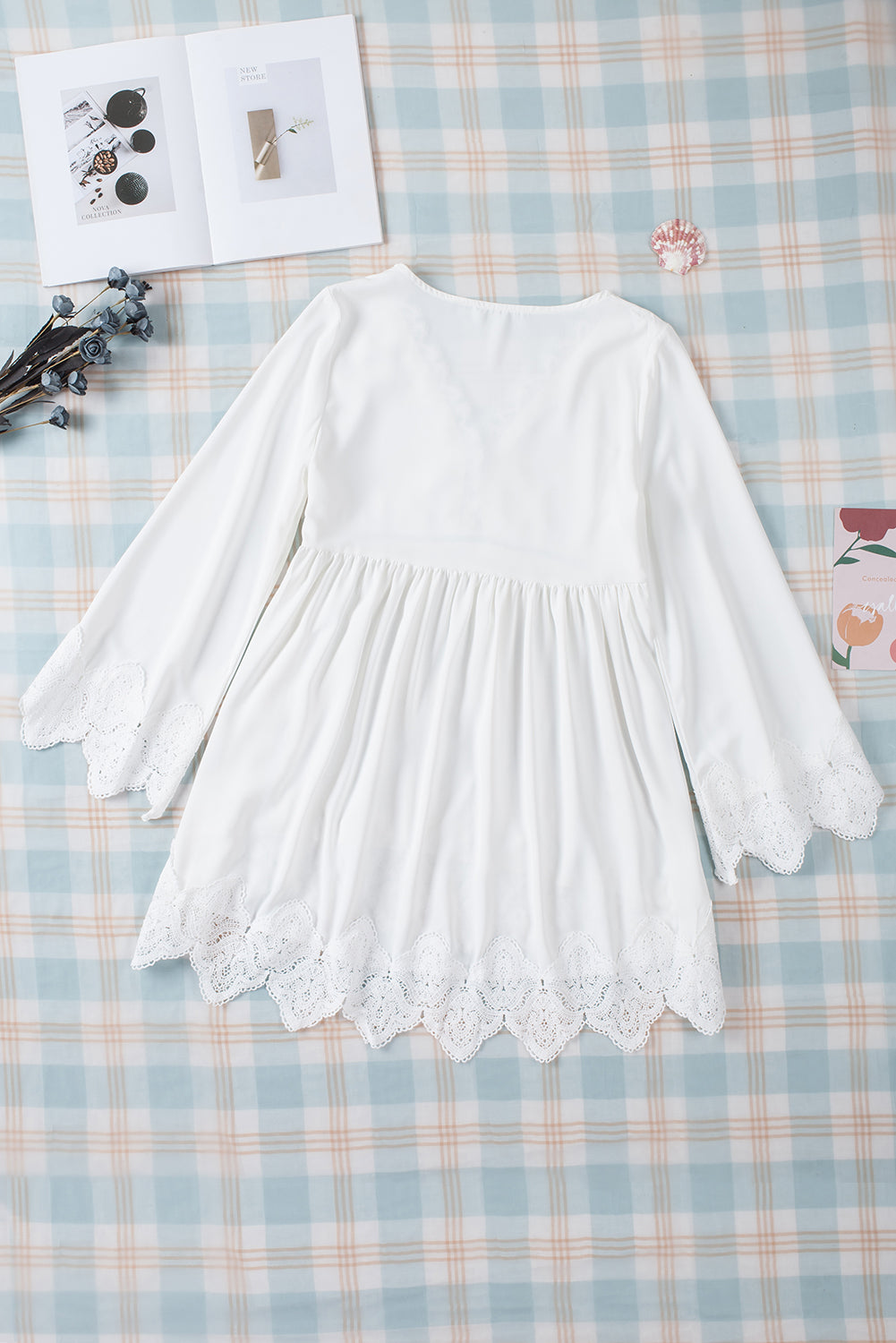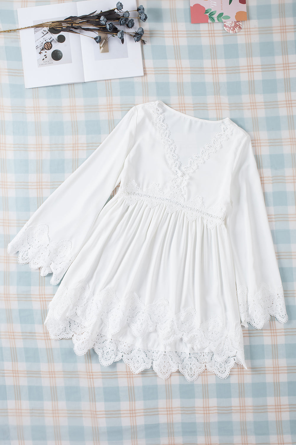 - It features crochet detailing, scalloped edges, beautiful pleats, bell sleeves, and a free spirit flowy fit