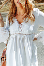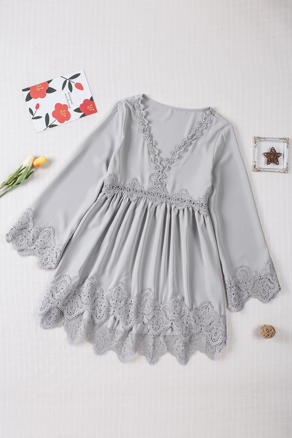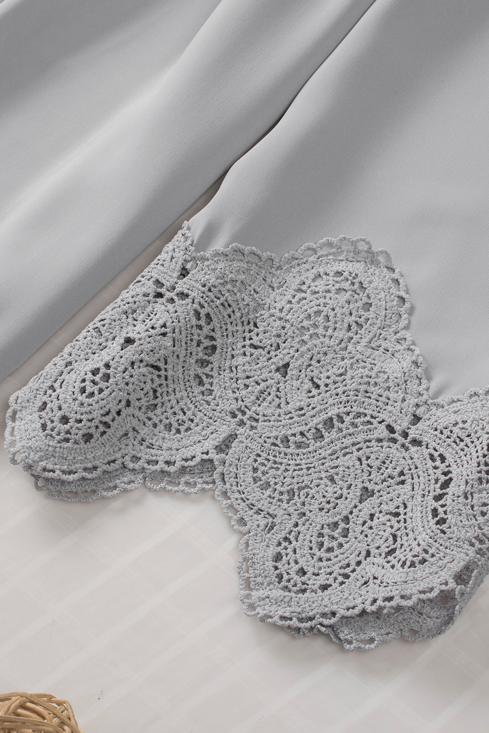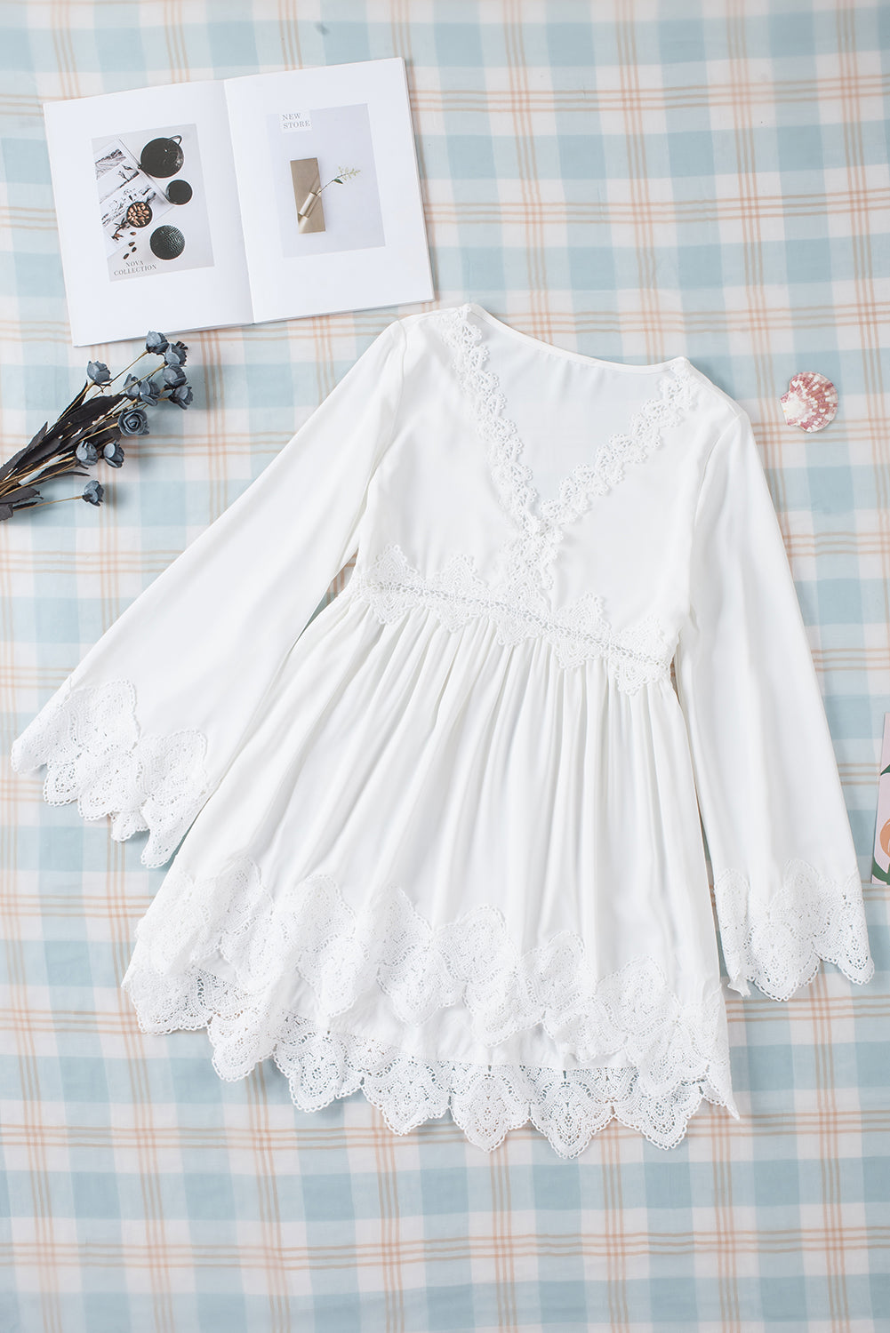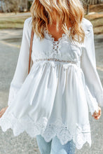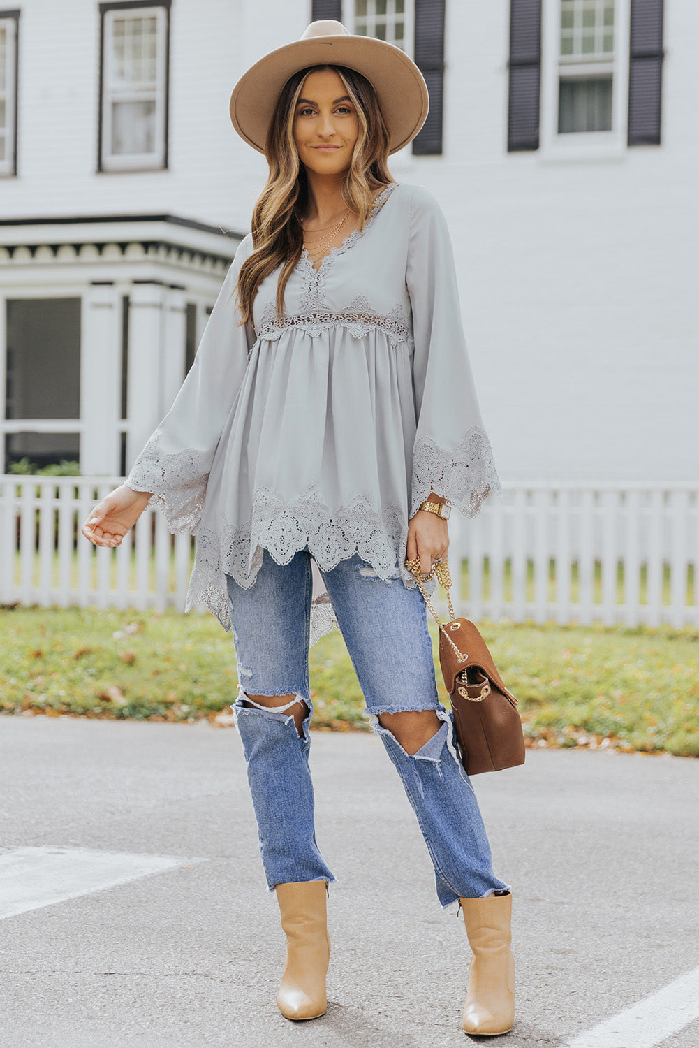 - It features crochet detailing, scalloped edges, beautiful pleats, bell sleeves, and a free spirit flowy fit