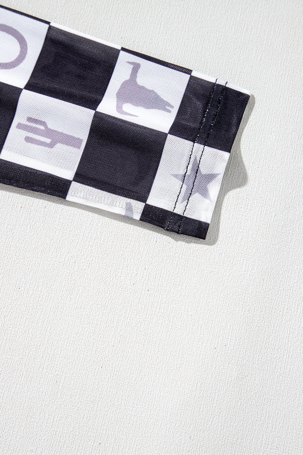 This long sleeve top features a striking black checkerboard print and Western-inspired elements. Made with lightweight and breathable mesh fabric, it offers both style and comfort. Elevate any outfit with this unique and versatile top.