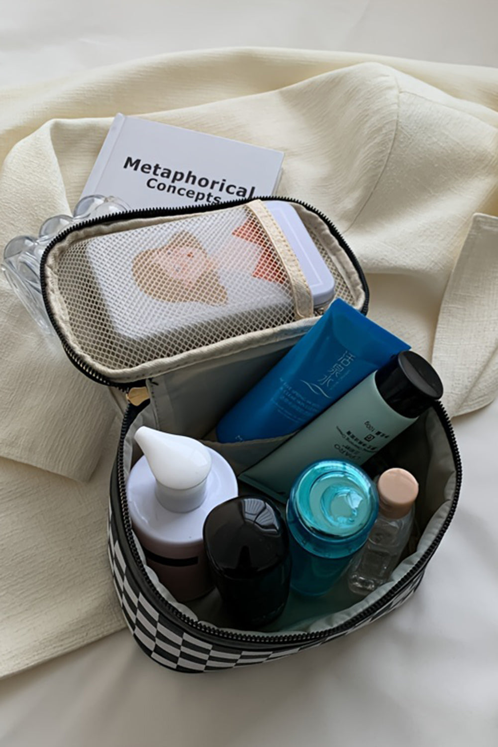 Black Checkered Zipper Large Cosmetic Bag with Handle