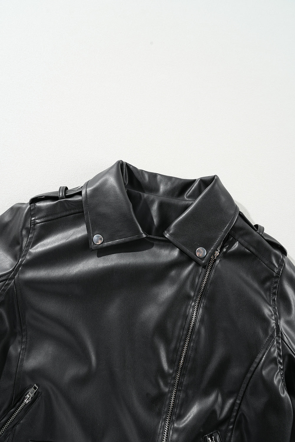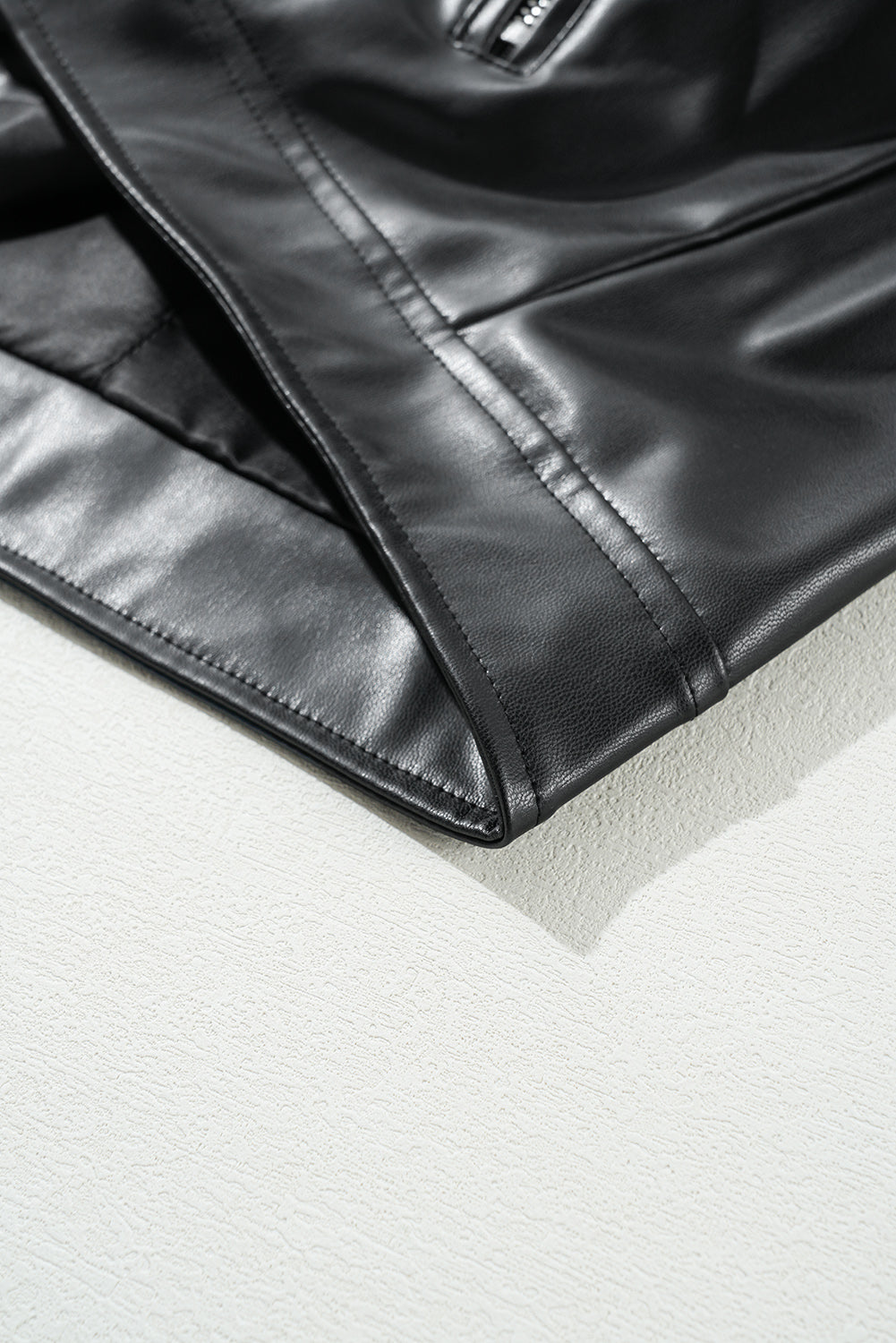This black PU leather jacket features a stylish lapel collar and a functional zipper, making it the perfect combination of fashion and practicality. The sleek design is versatile and can easily be dressed up or down. Experience the durability and timeless style of this must-have jacket.
