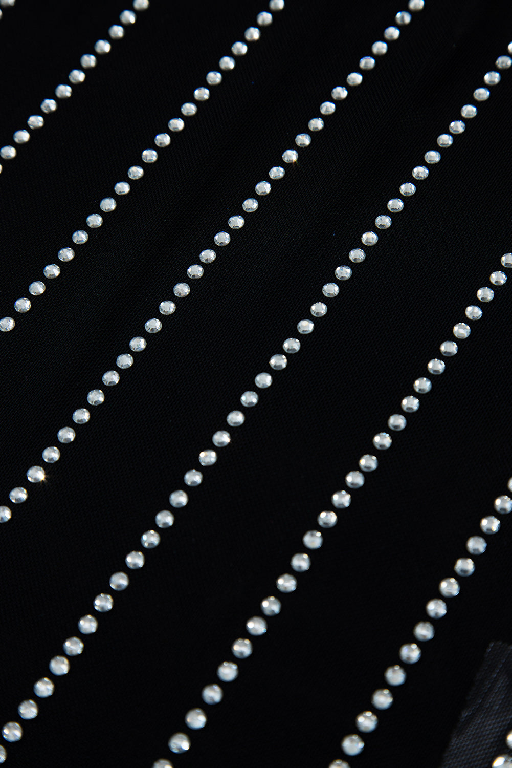 Enhance your wardrobe with our Black Rhinestone Decor Striped Mesh Long Sleeve Bodysuit. The gorgeous rhinestone detailing adds a touch of glamour, while the striped mesh design gives a subtle yet alluring look. Perfect for a night out or special occasion, this bodysuit offers both style and comfort.