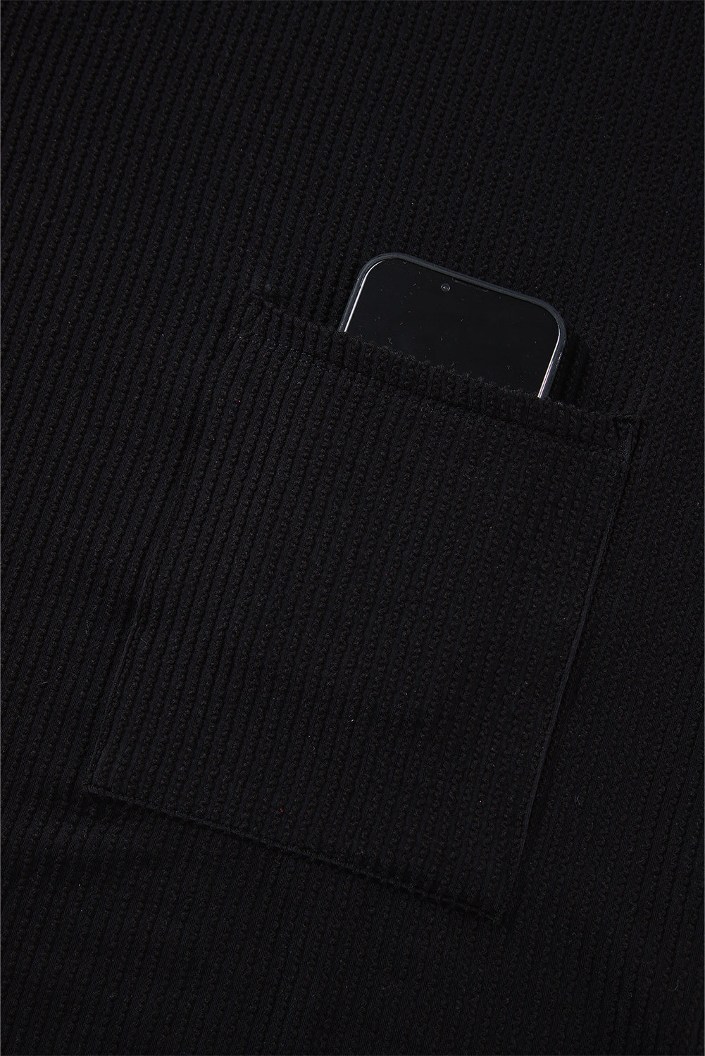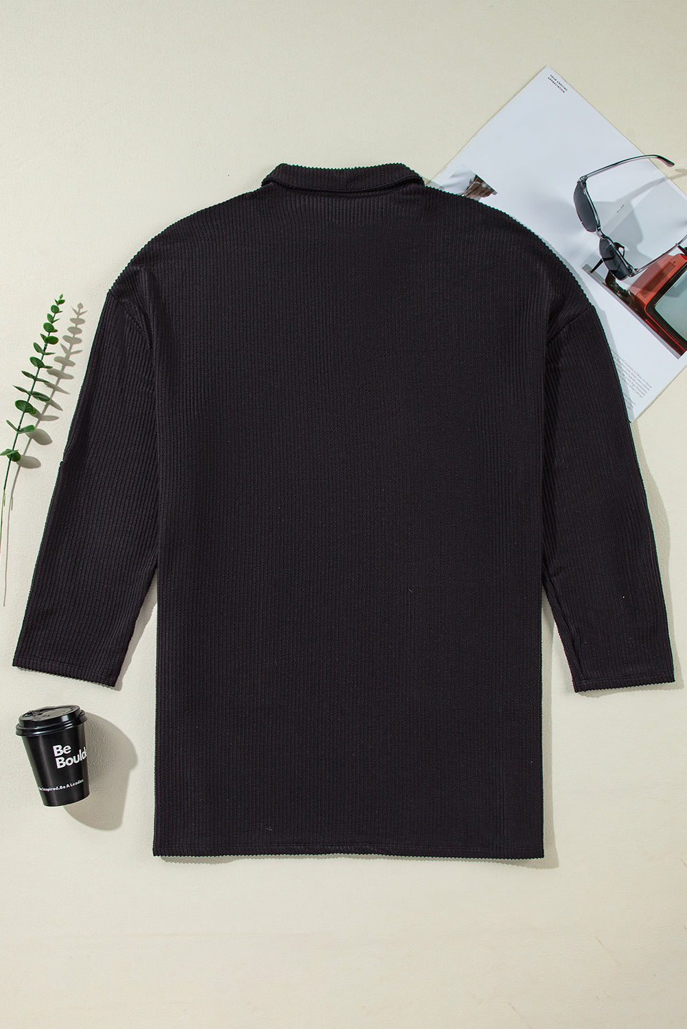 Black Ribbed Knit Buttoned Collared Roll Tab Sleeve Plus Size Mini Dress