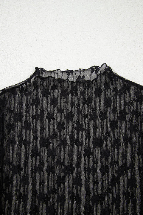 • This black sheer top features delicate floral lace and a slim fit design, creating an elegant and sophisticated silhouette. The long sleeves enhance its refined appeal, while the lightweight sheer fabric offers subtle allure and breathability. Perfect for layering or wearing alone, it adds a touch of timeless femininity to any outfit.