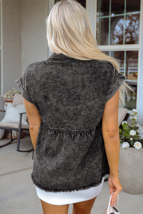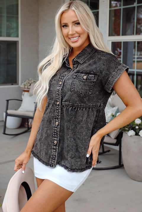 Black Short Sleeve Flap Pocket Button Up Raw Hem Denim Shirt