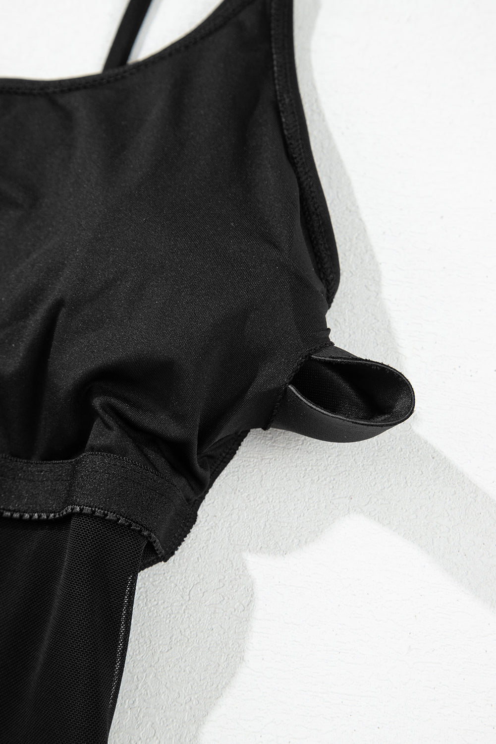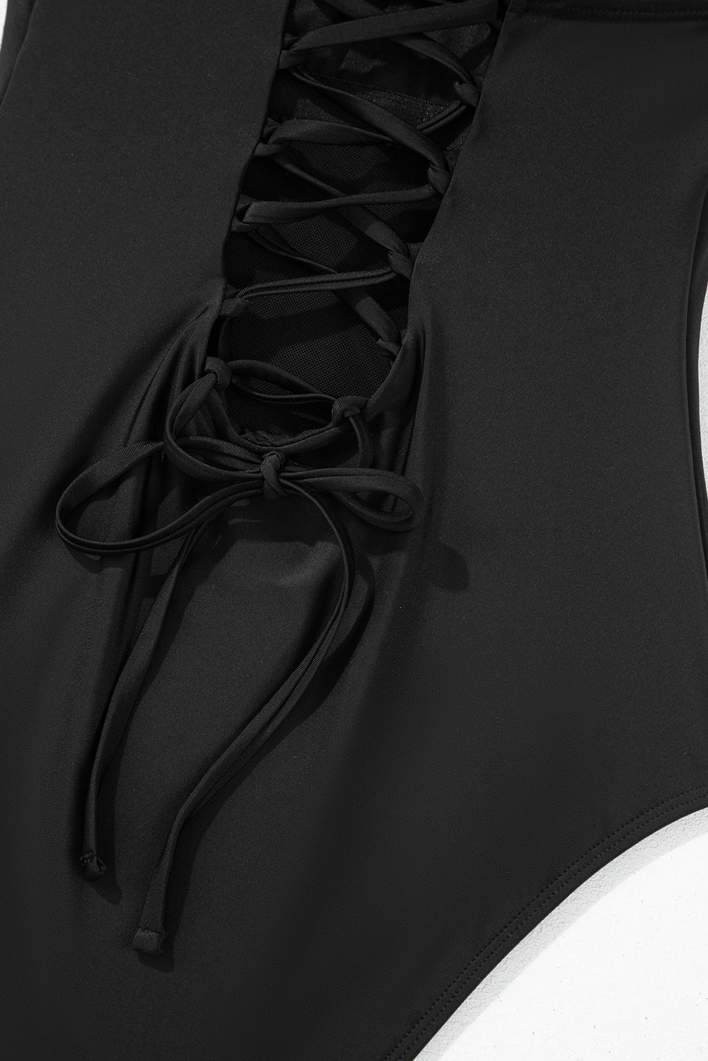 Black Thin Strap Strappy Lace-up Open Back One Piece Swimsuit