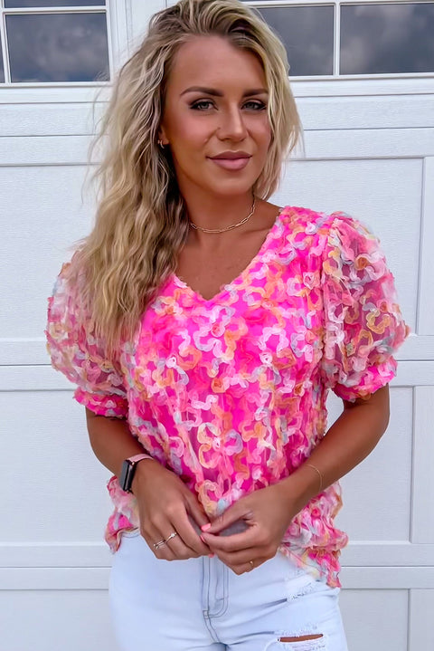 Bonbon Flowery Mesh Short Puff Sleeve Blouse