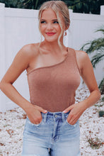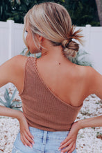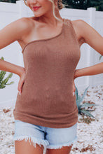 - A tank top features a ribbed knit fabric and one shoulder silhouette