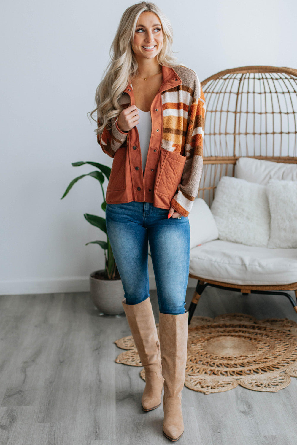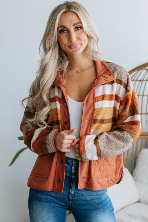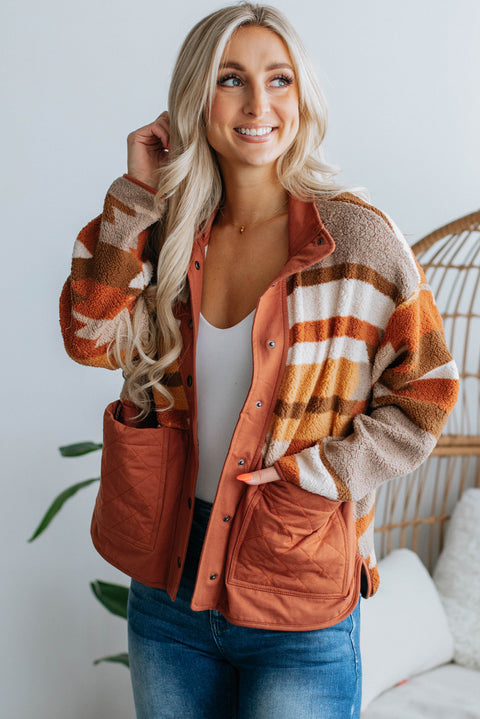 Brown Quilted Patch Pockets Aztec Furry Jacket