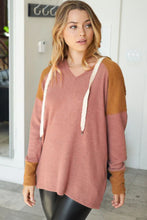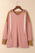 Brown Waffle Knit Patchwork Drawstring V Neck Hoodie