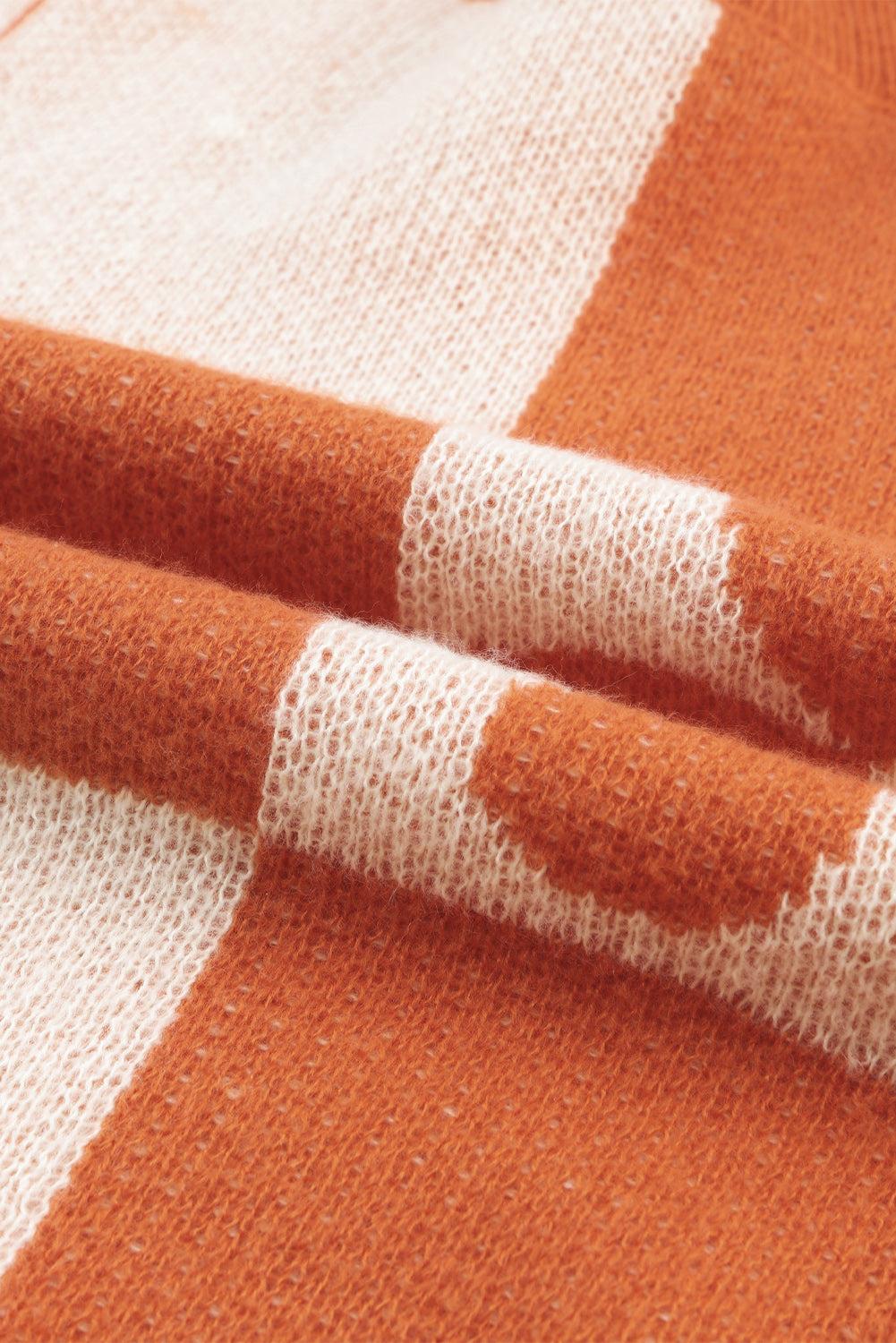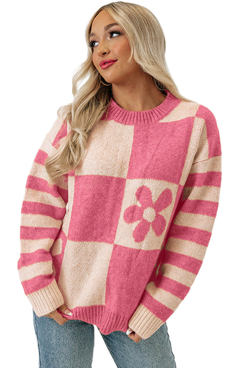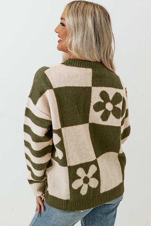 Brown Checkered Floral Print Striped Sleeve Sweater
