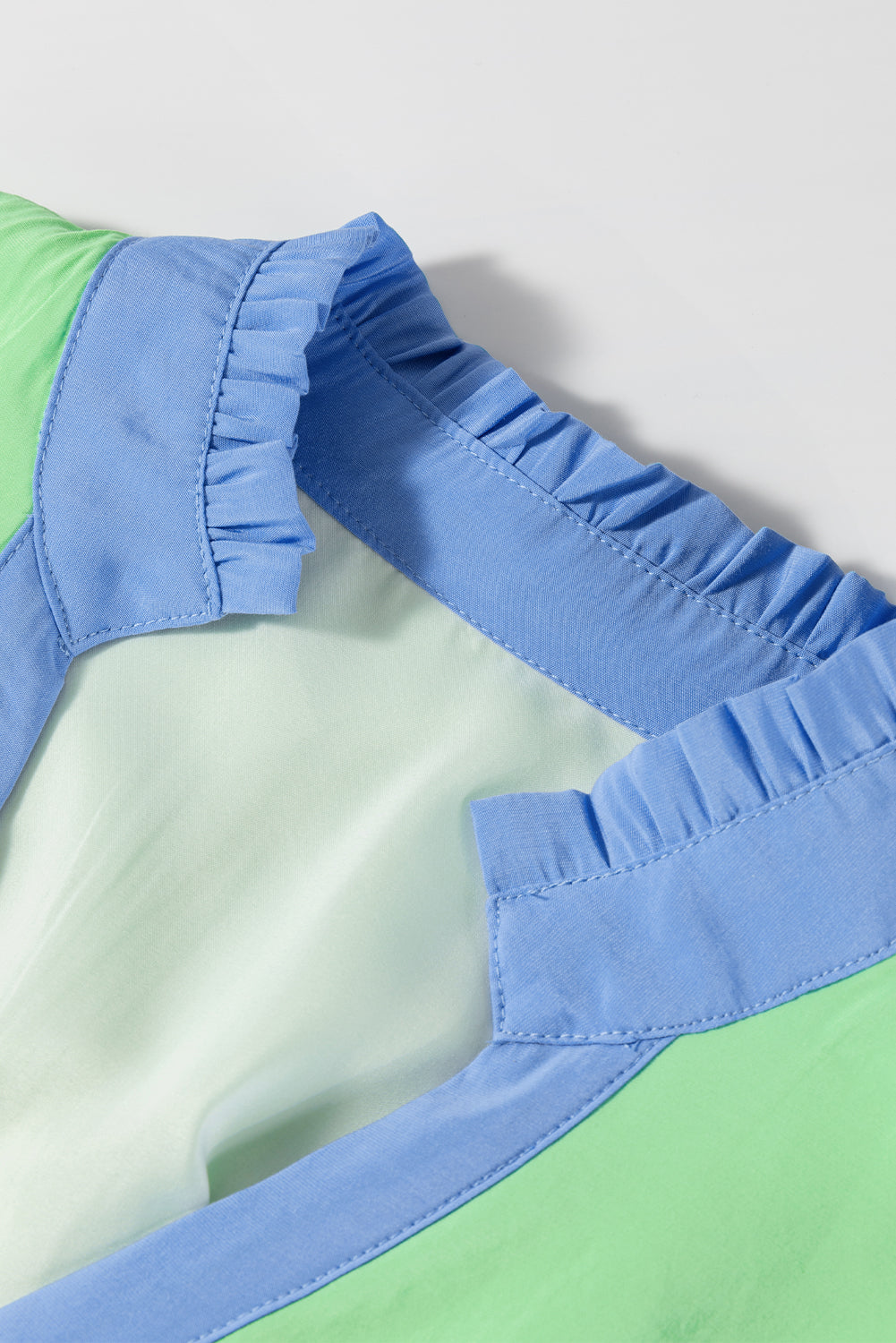 The V-neck is accented with frills creating a flattering and feminine look that draws the eye to the neckline.