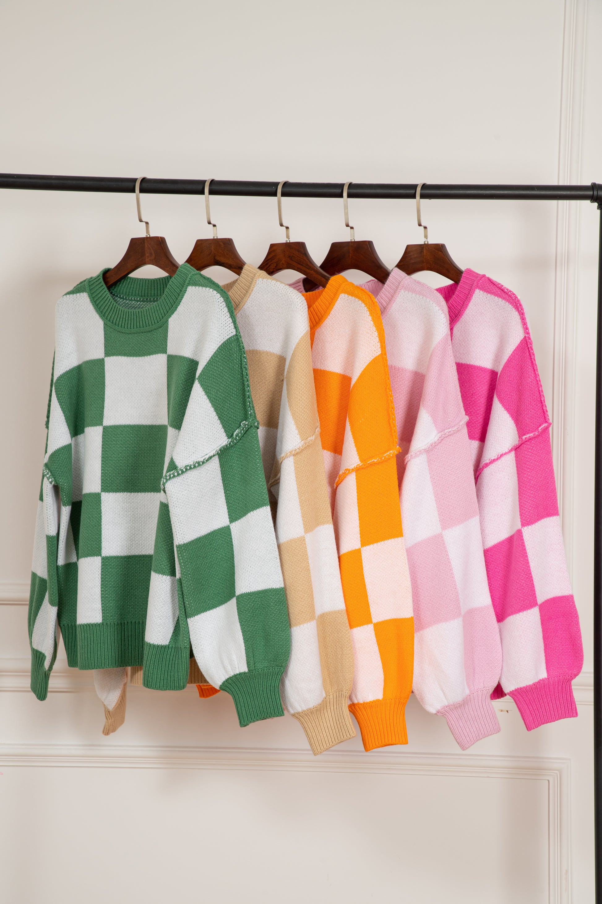 Elevate your wardrobe with this stylish Checkered Bishop Sleeve Sweater - Crafted with premium fabric for a luxuriously soft feel