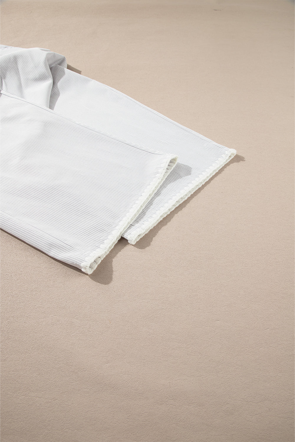 Get ready to elevate your wardrobe with our Gray Stripe Zipped up Collar Ruffled Sleeve Tee and Wide Leg Pants 2pcs Outfit. The perfect combination of style and comfort, this outfit features a modern striped design, a convenient zipper collar, and flattering wide leg pants. Make a statement and stay comfortable at the same time with this must-have outfit.