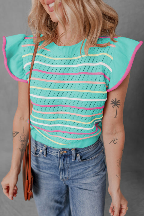 Green Colorful Striped Eyelet Knit Ruffled Sleeve Sweater T Shirt