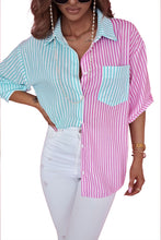 - Features a 2-tone striped fabric, a collared neckline and long sleeves with button cuffs