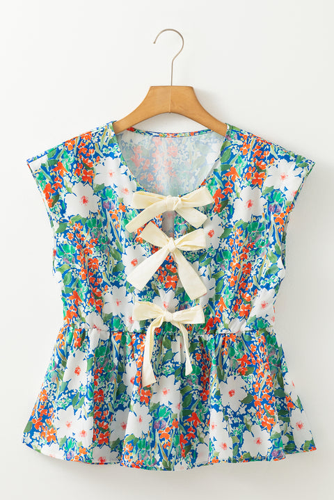 Green Floral Print Bow Applique Slit Sleeveless Peplum Blouse