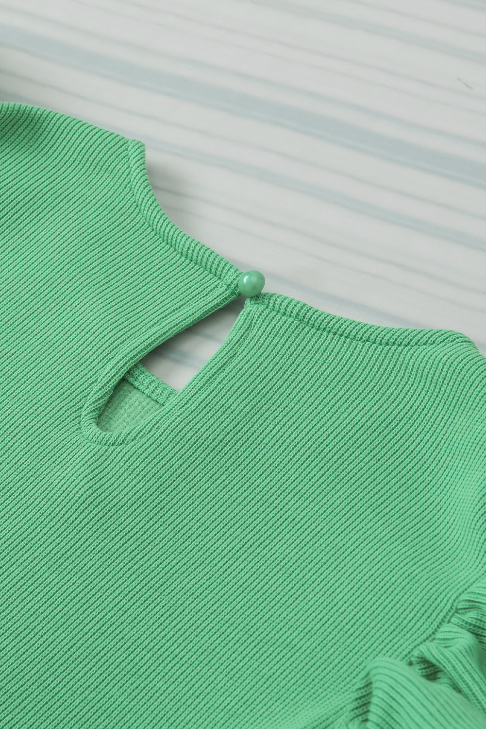 Green Ribbed Knit Puffy Ruffle Sleeve Blouse