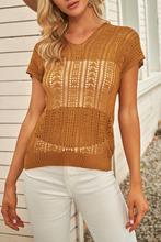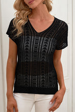 •Textured hollow-out knit top, short-sleeved, v neck and ribbed hemline cut