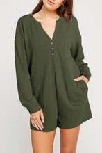 Khaki Brushed Ribbed Button Split V Neck Long Sleeve Romper