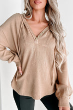 Khaki Buttoned V Neck Drawstring Knit Hoodie