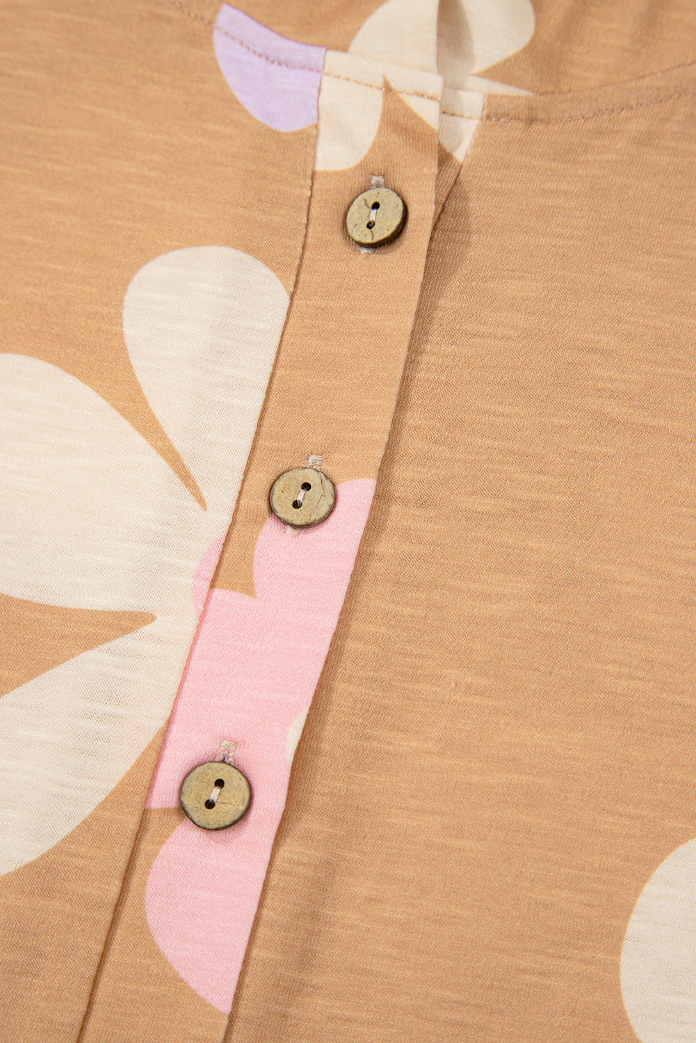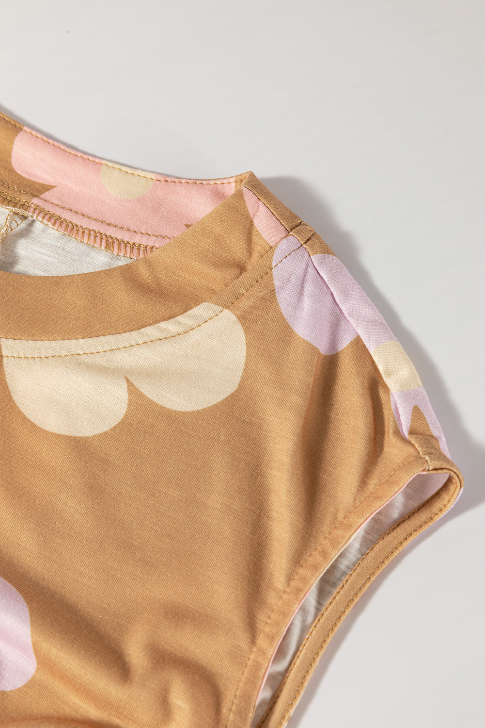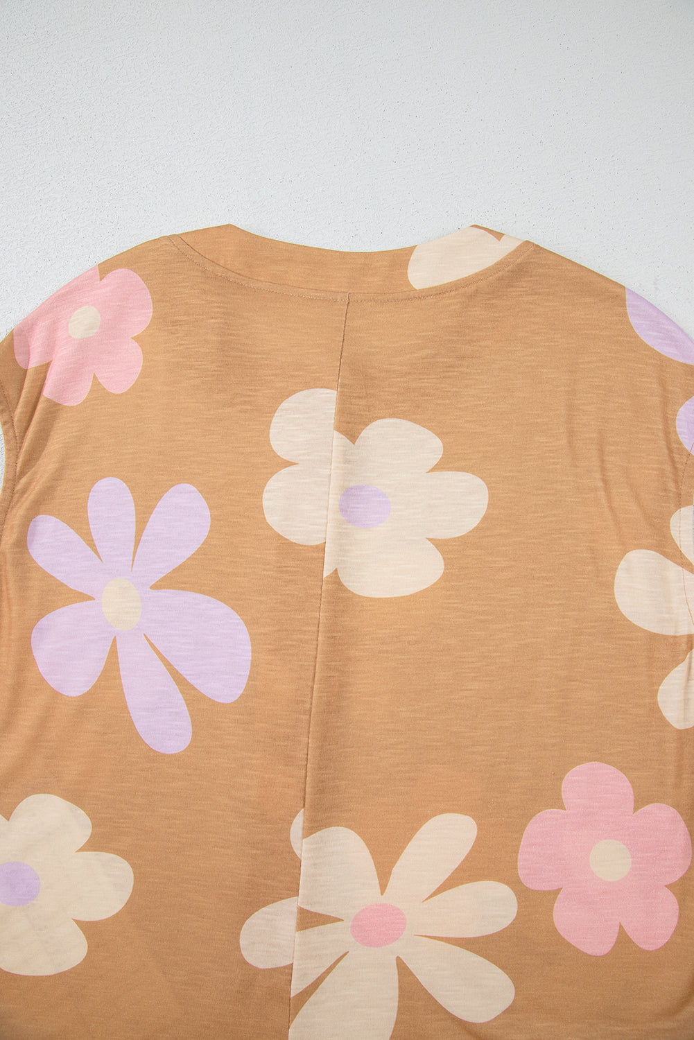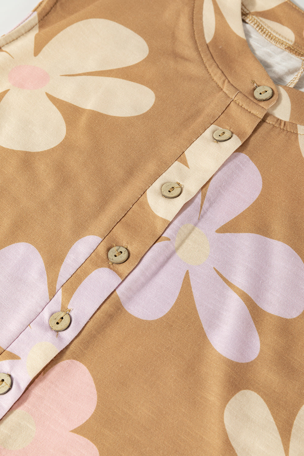 Khaki Floral Print Sleeveless Button up Wide Leg Loose Jumpsuit
