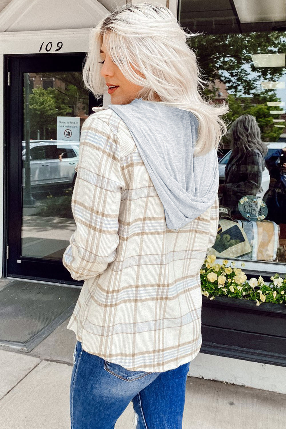 •Stylish shacket jacket with buttons closure, flap pockets and contrast solid hood on the back