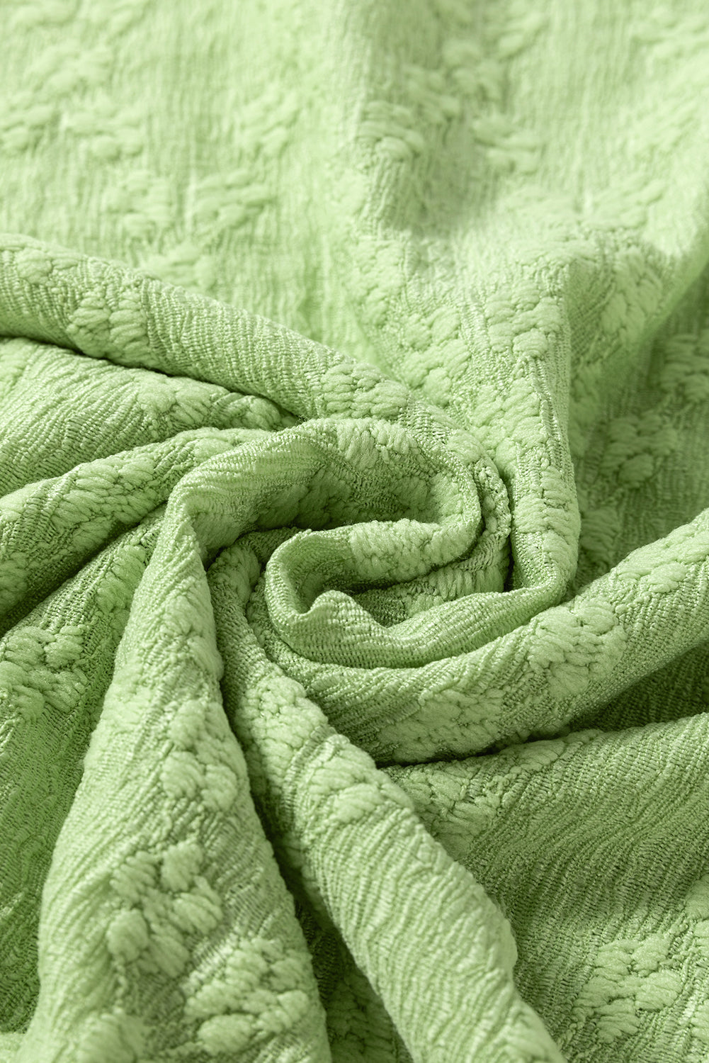 This light green blouse features a solid textured design with side splits and a crew neck. Made with high-quality materials, it offers a comfortable and stylish fit. Perfect for any occasion, this blouse will add a touch of elegance to your wardrobe.