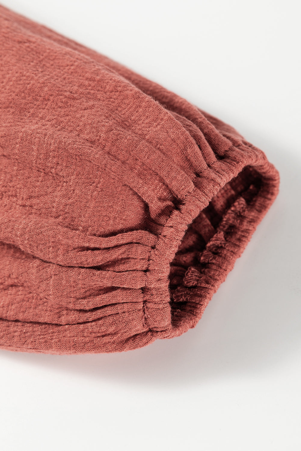 Mineral Red Solid Color Textured Frilled Trim V Neck Puff Sleeve Blouse