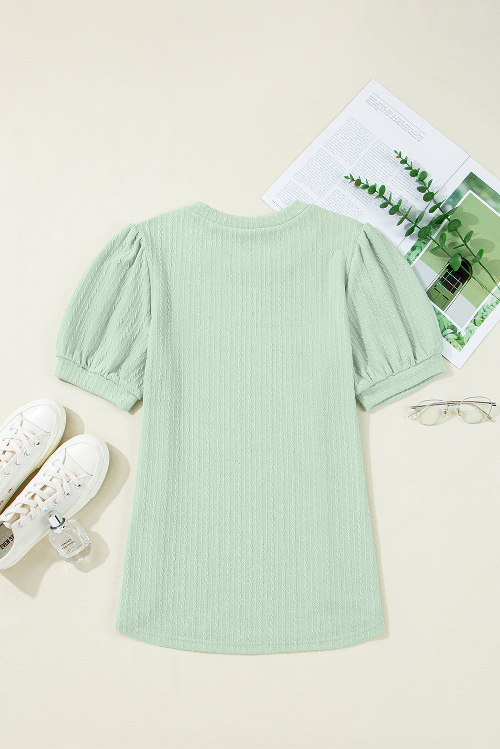 Mist Green Textured Round Neck Short Puff Sleeve Top