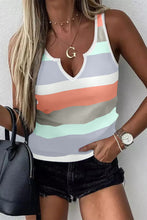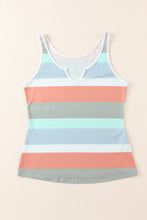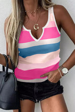 - The Striped Color Block Notched Neck Tank Top is a stylish and versatile piece that features a unique color block design with contrasting stripes, giving it a bold and eye-catching look