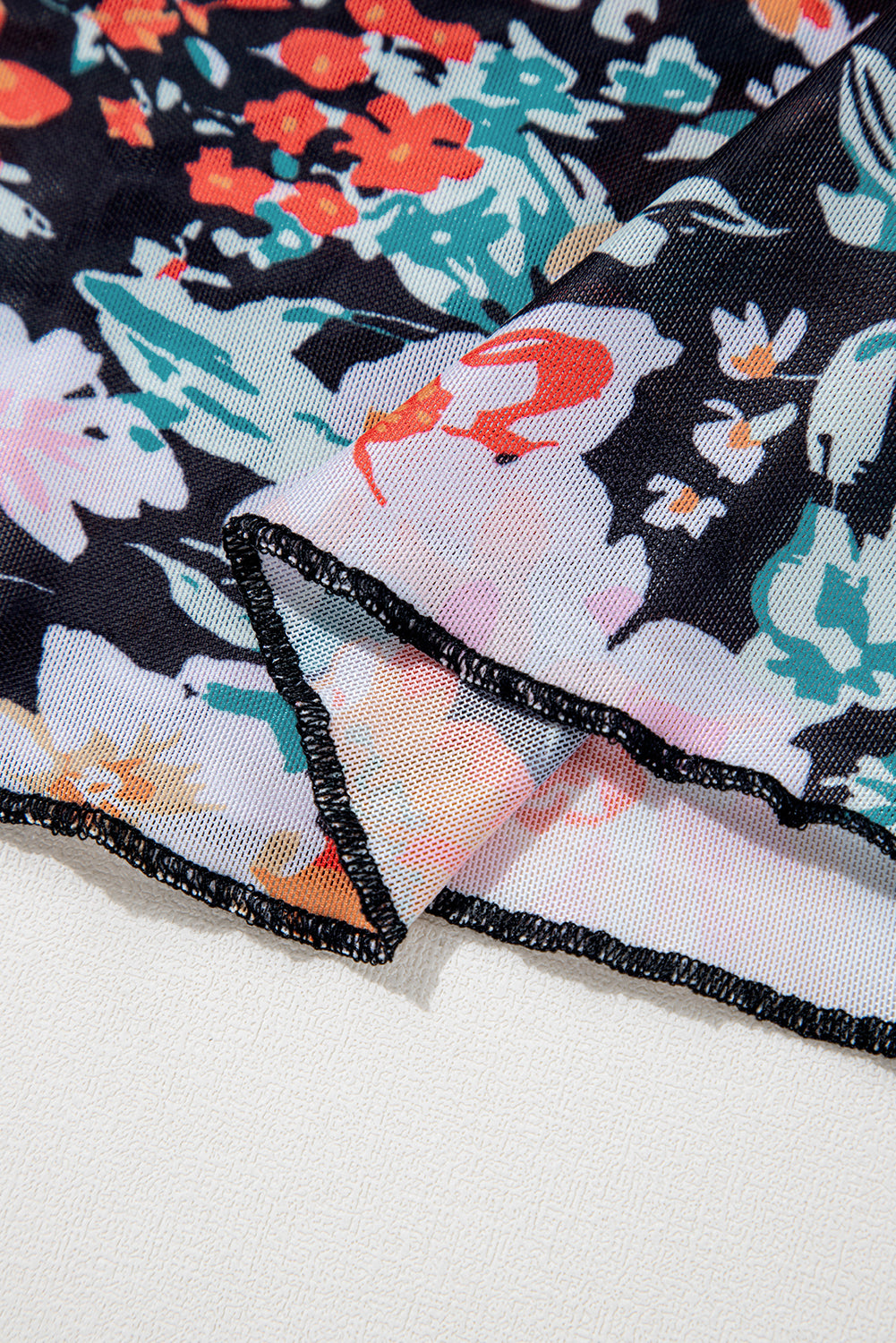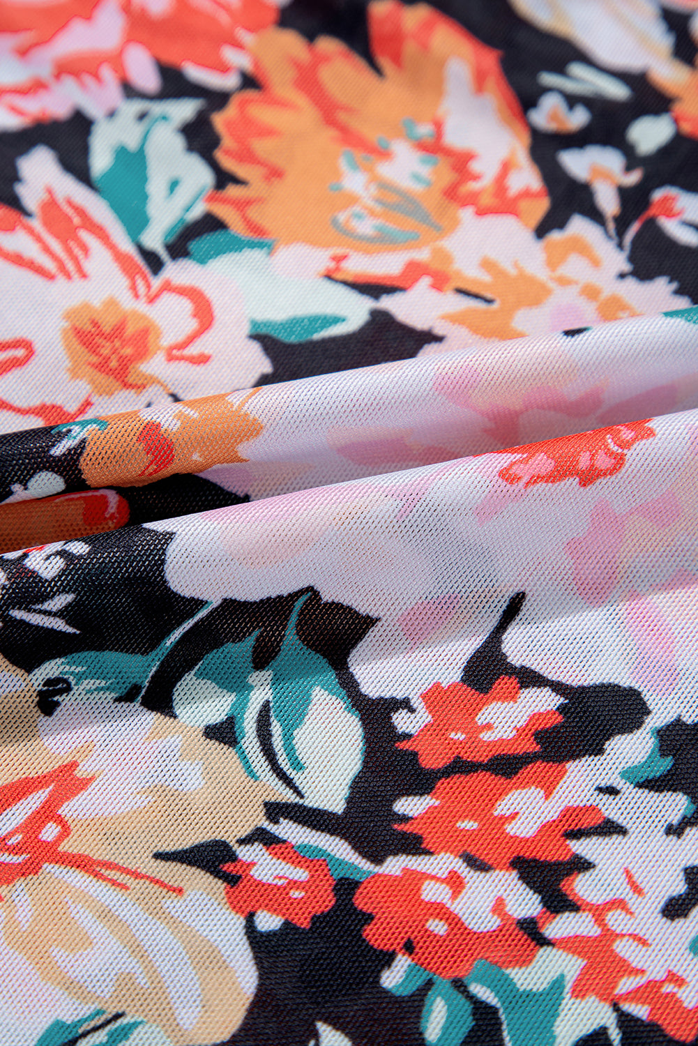 Orange Floral Mesh Slim Long Sleeve Crop Top