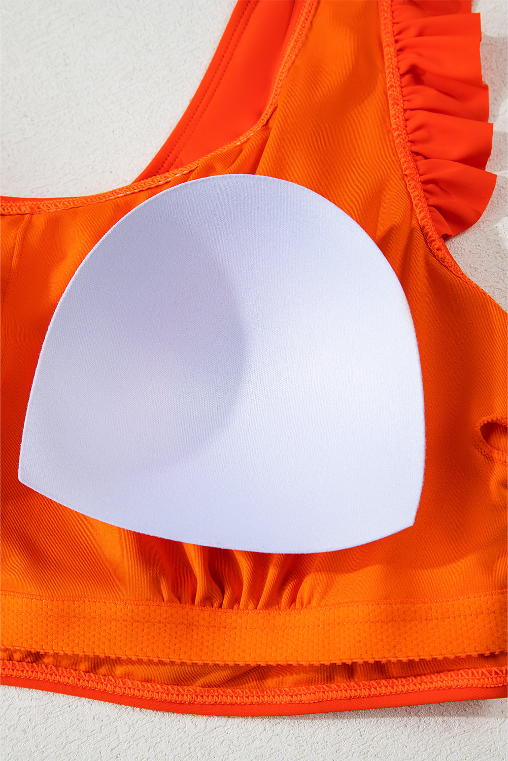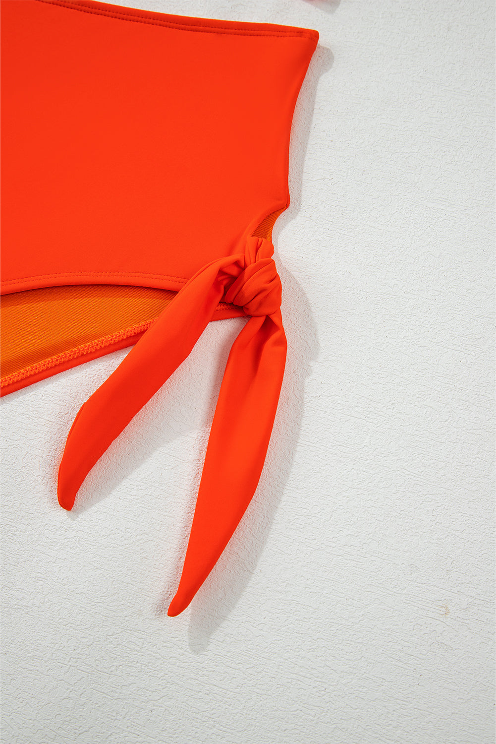 This plus-size bikini set features a trendy high-waisted design with a flattering knotted detail. The vibrant orange color and playful ruffled trim add a touch of fun to this stylish swimsuit. Perfect for any body type, this bikini set will have you feeling confident and comfortable at the beach or pool.