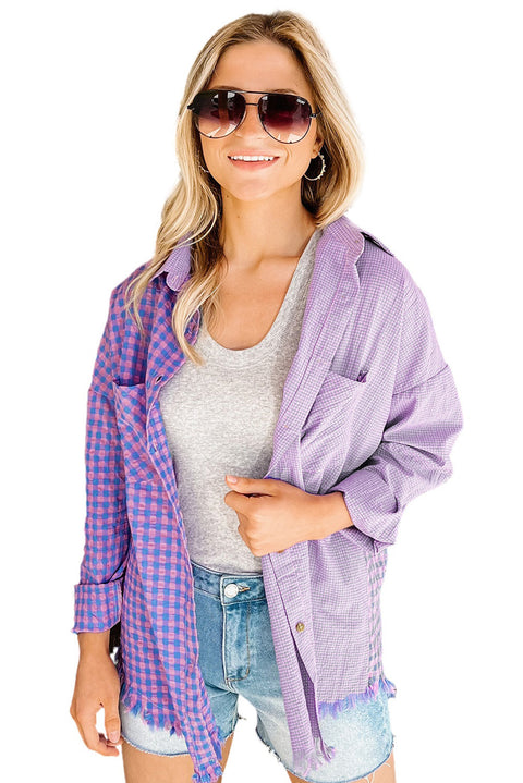 Purple Mixed Plaid Button Down Long Sleeve Chest Pocket Shirt