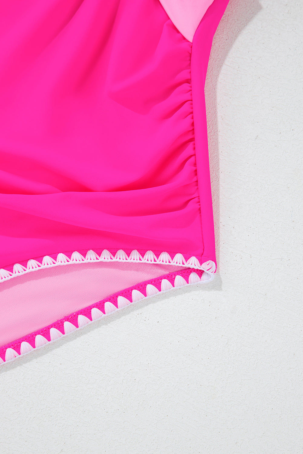 This rose red one piece swimsuit features a unique contrasted patchwork design with delicate ric rac trim and cutout detailing. Made with high-quality materials, it offers both style and comfort for a chic beach look.